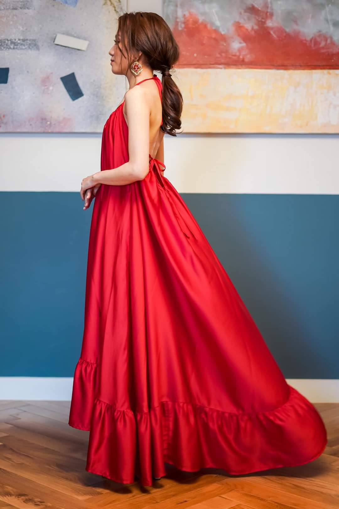 Faites tourner les têtes avec cette captivante robe longue en soie signée Sarah Luton, conçue pour allier polyvalence et élégance fluide. Son décolleté froncé et ses multiples options de liens dos nu permettent de personnaliser le style, tandis que son dos nu et ses bretelles réglables assurent une coupe flatteuse. Sa silhouette trapèze volumineuse se prolonge naturellement par un ourlet à volants spectaculaire, ce qui en fait un choix remarquable pour les soirées, les escapades en hôtel ou les soirées modernes. Confectionnée en soie douce et brillante, cette robe allie allure et sophistication.