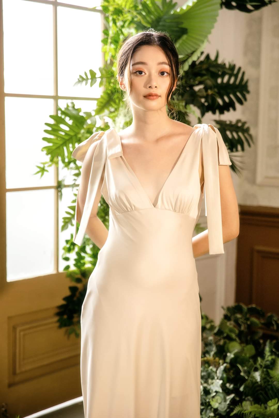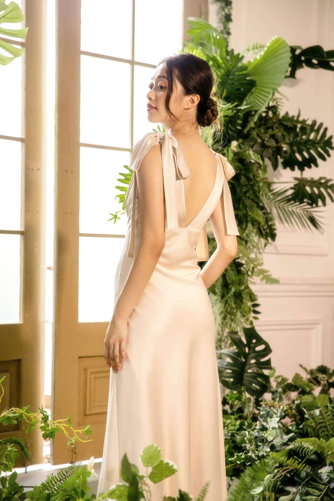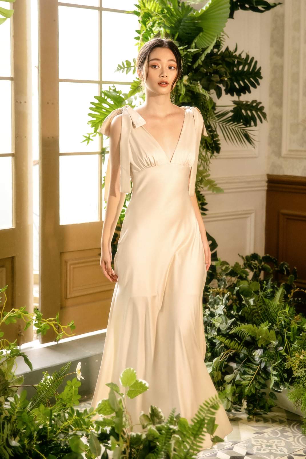 Cette robe en soie aérienne signée Sarah Luton est conçue pour sublimer l'élégance féminine jusque dans les moindres détails. Confectionnée en soie fluide, elle présente un décolleté plongeant en V et de délicates bretelles à nouer qui drapent les épaules, créant des lignes douces et romantiques. Sa coupe en biais assure une fluidité gracieuse à chaque pas, tandis que son dos nu ajoute une touche d'élégance. Idéale pour les mariages d'été, les garden-parties ou les soirées sophistiquées, cette robe en soie allie style intemporel et charme moderne. Le drapé luxueux de la soie sublime son mouvement, ce qui en fait une pièce incontournable de toute garde-robe soignée.