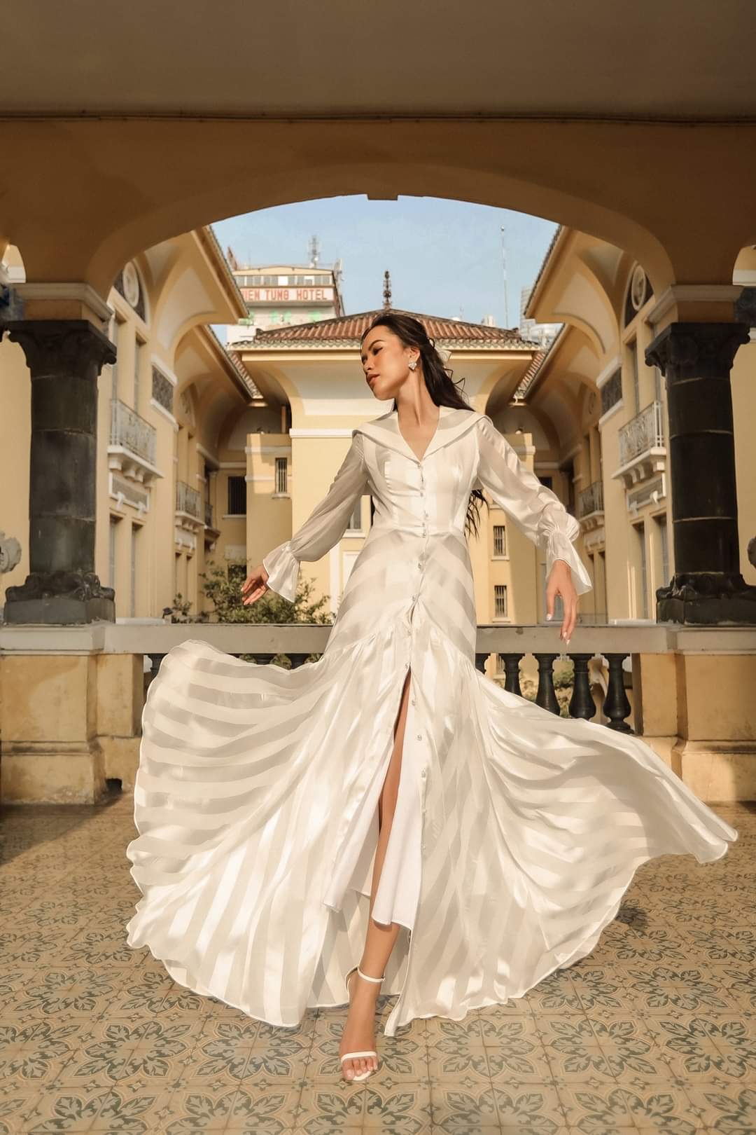 Sublimez votre garde-robe avec cette robe longue en soie signée Sarah Luton, confectionnée dans un tissage délicatement rayé qui reflète la lumière à chaque mouvement. Dotée d'un col marin et d'une fermeture boutonnée sur le devant, elle structure subtilement une silhouette fluide et féminine. Les manches longues sont froncées aux poignets pour plus de volume, tandis que l'ourlet évasé et la fente haute apportent grâce et élégance. Qu'elle soit portée pour des événements formels ou pour une soirée chic, cette robe en soie incarne la sophistication raffinée et le luxe polyvalent.