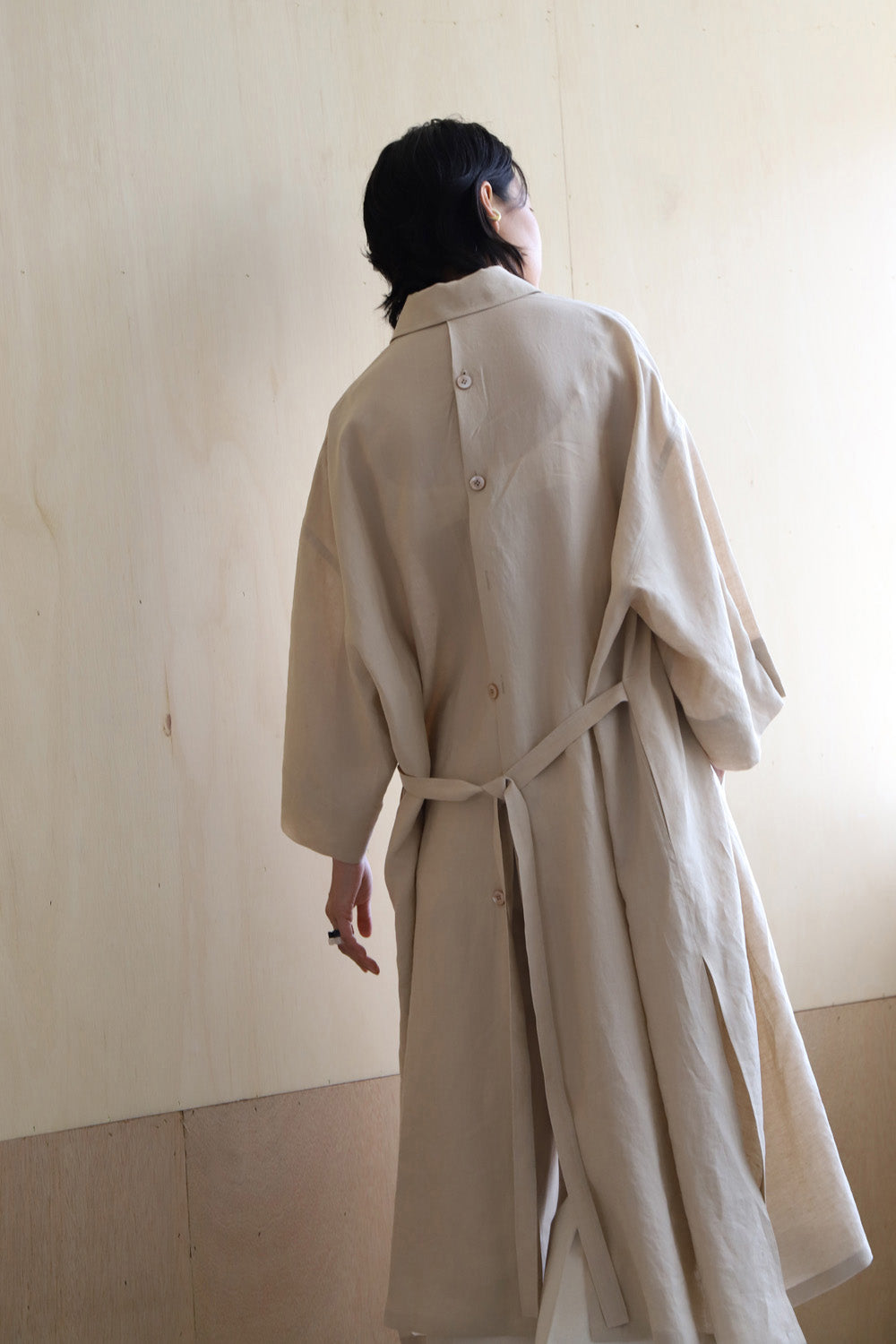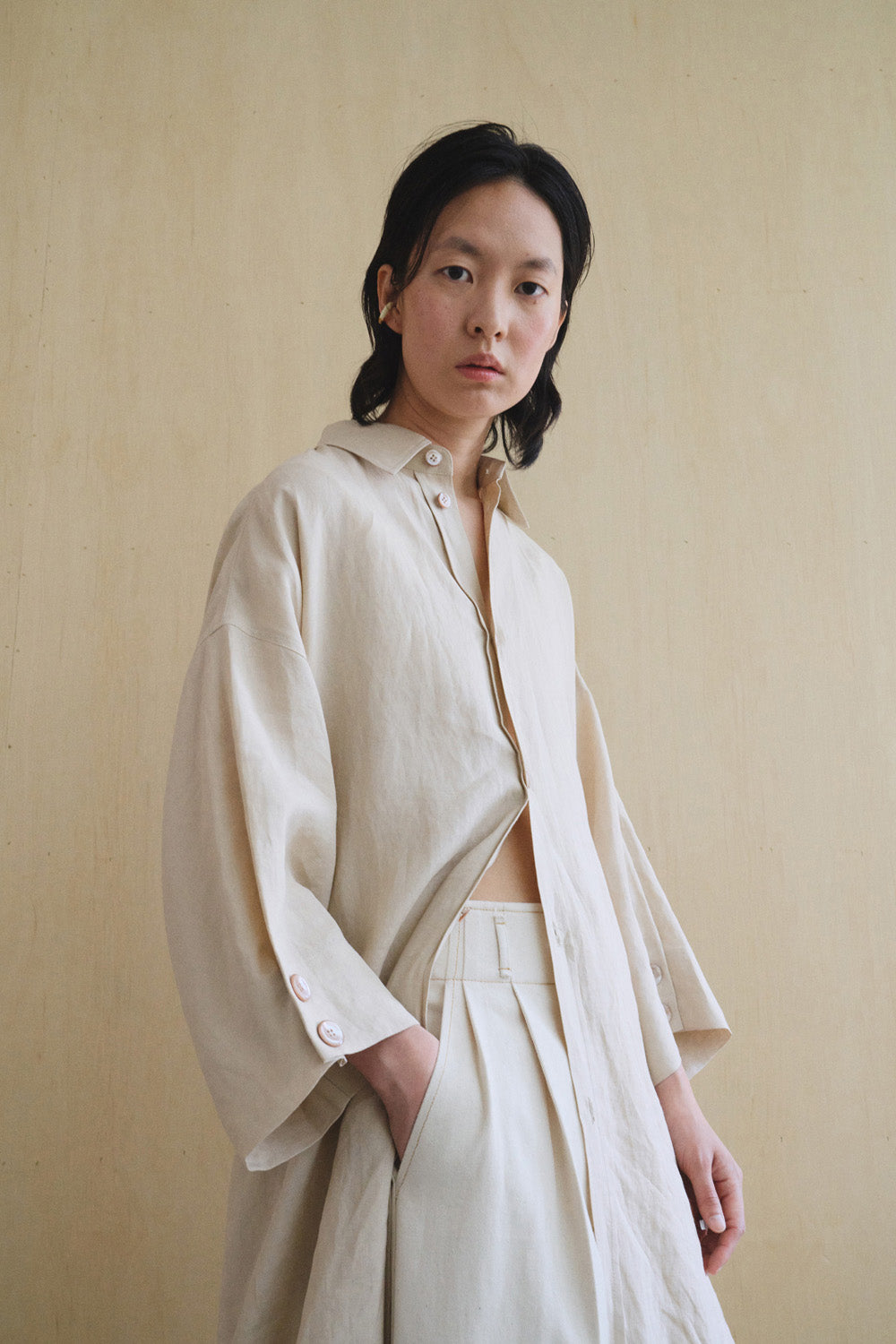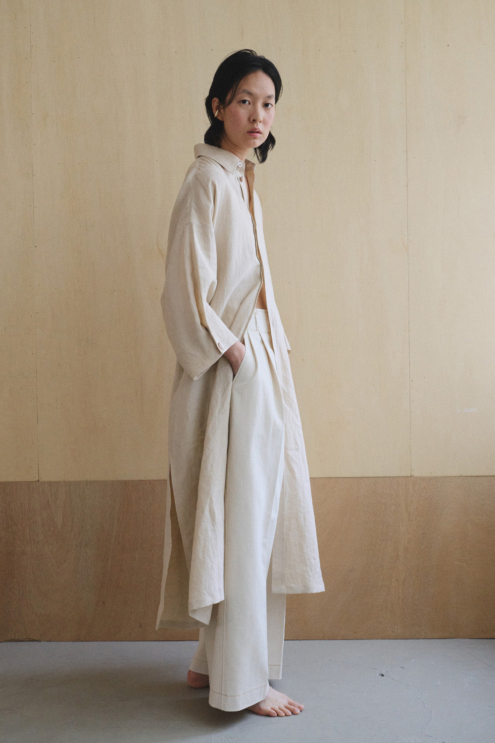 Cette veste en lin signée Sarah Luton offre une silhouette sculpturale et contemporaine au charme minimaliste. Confectionnée dans un mélange de lin doux, sa coupe longue présente une patte de boutonnage épurée, des épaules tombantes et des fentes latérales pour une liberté de mouvement optimale. Son détail remarquable est sa fermeture boutonnée au dos, qui revisite avec raffinement les vêtements d'extérieur traditionnels. Légère et respirante, elle se prête parfaitement à la superposition pour la mi-saison. Sa coupe décontractée et son tombé fluide en font un incontournable polyvalent pour une tenue sobre et raffinée.