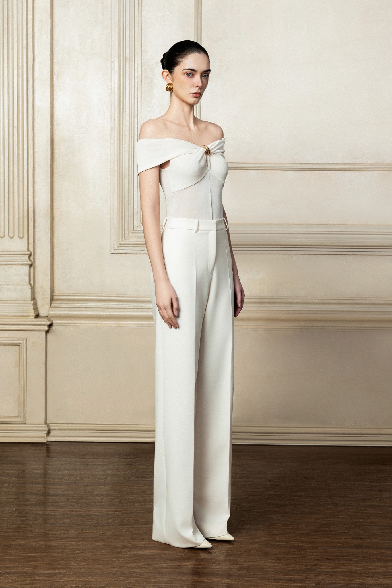 Le haut en maille à épaules dénudées de Laura Ren redéfinit le minimalisme élégant avec une silhouette raffinée et sculpturale. Confectionné en maille douce, il présente un décolleté gracieusement drapé qui se replie sur les épaules, accentué par une torsade centrale froncée ornée de détails dorés. Le corsage semi-transparent contraste subtilement avec l'encolure opaque, apportant profondeur et sophistication à la pièce. Parfait avec un pantalon taille haute ou une jupe fluide, ce haut allie modernité et charme intemporel. Avec sa coupe épurée et sa construction raffinée, ce modèle incarne l'engagement de Laura Ren pour une sophistication naturelle et une féminité affirmée, idéal pour une tenue de jour raffinée ou une soirée raffinée.