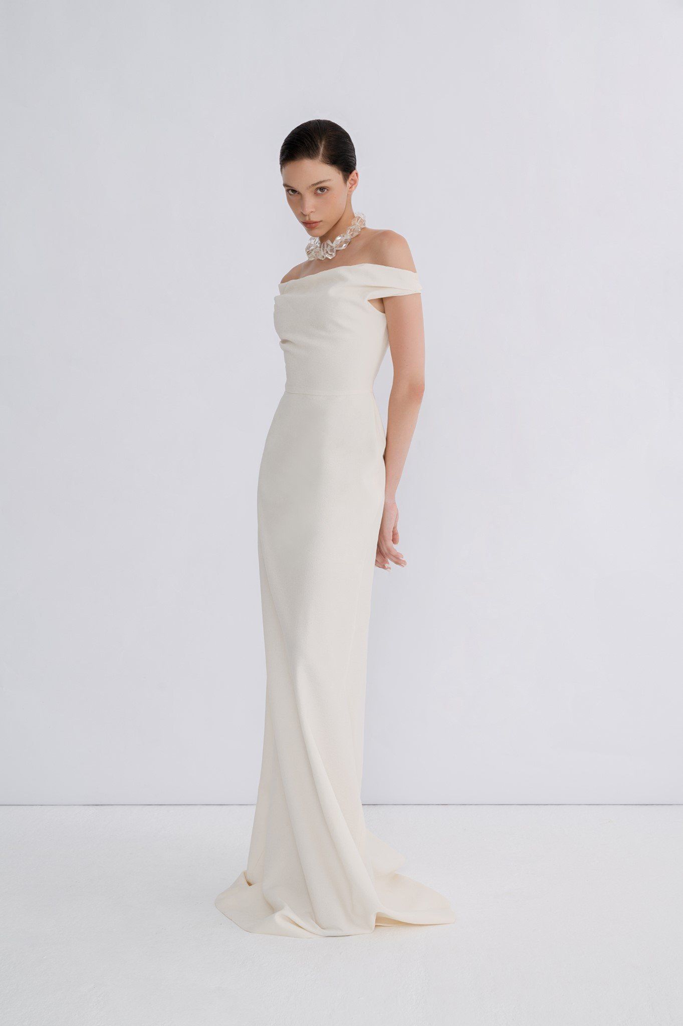 La robe en crêpe à épaules dénudées Laura Ren offre une interprétation raffinée de l'élégance minimaliste. Confectionnée en crêpe texturé, cette robe longue présente un décolleté drapé gracieux qui descend jusqu'aux épaules, soulignant les clavicules avec une élégance naturelle. Sa silhouette moulante se prolonge par un ourlet long et subtilement structuré, idéal pour les occasions formelles et les soirées élégantes. Avec sa coupe intemporelle et sa sobriété moderne, cette pièce incarne l'essence même de la sensibilité sophistiquée de Laura Ren. Parfaite pour les occasions où le luxe discret laisse une impression durable.