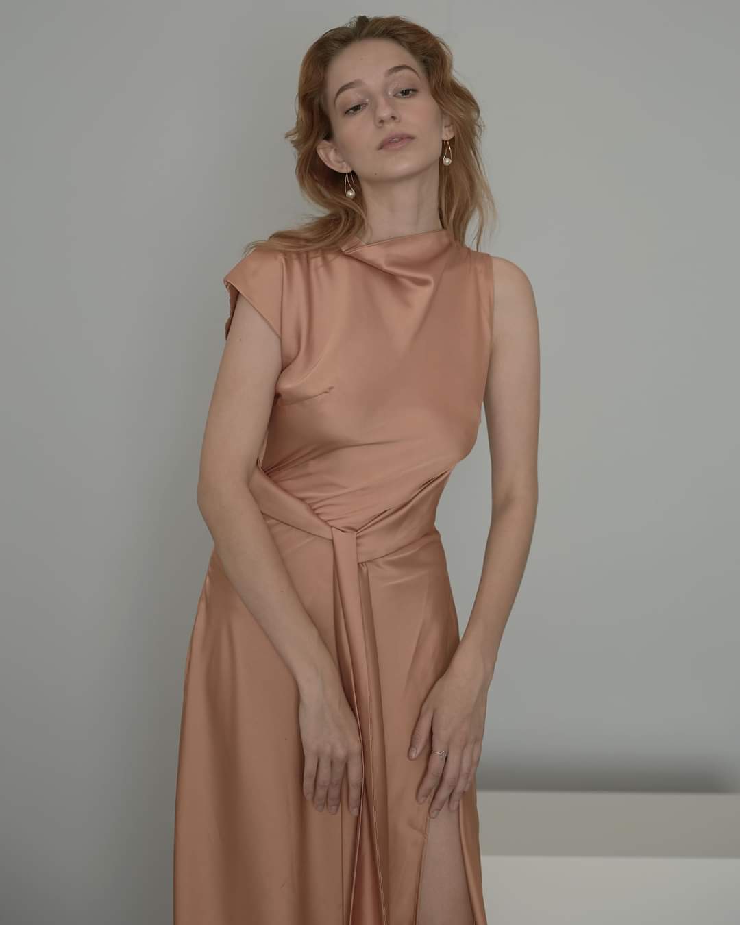 Cette robe asymétrique drapée en soie signée Sarah Luton apporte une touche de minimalisme moderne aux tenues de soirée. Confectionnée en soie légère au fini brillant, elle présente un décolleté asymétrique, des plis souples à la taille et une ceinture fluide sur le côté qui lui confère une dimension gracieuse. La fente haute contraste avec les lignes épurées et la silhouette raffinée. Idéale pour les soirées élégantes ou les occasions spéciales, cette pièce allie sophistication et mouvement. Sublimez votre garde-robe formelle avec cette pièce Sarah Luton, synonyme de féminité raffinée et d'intemporalité.