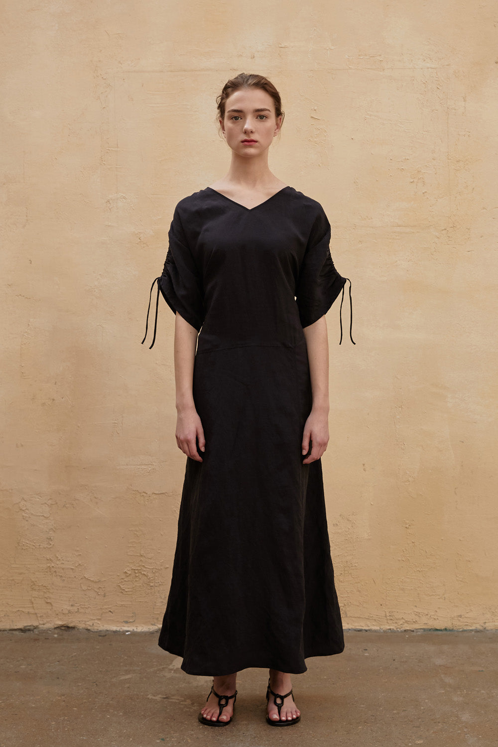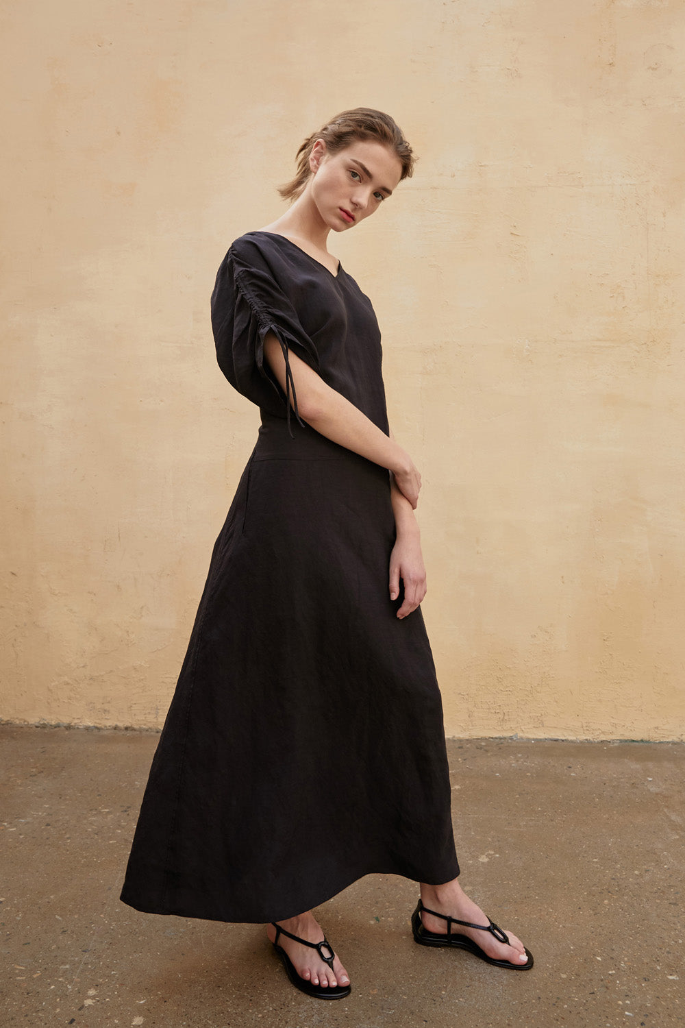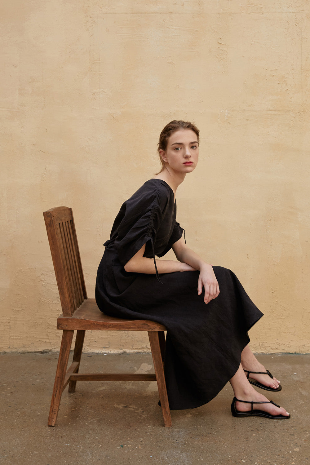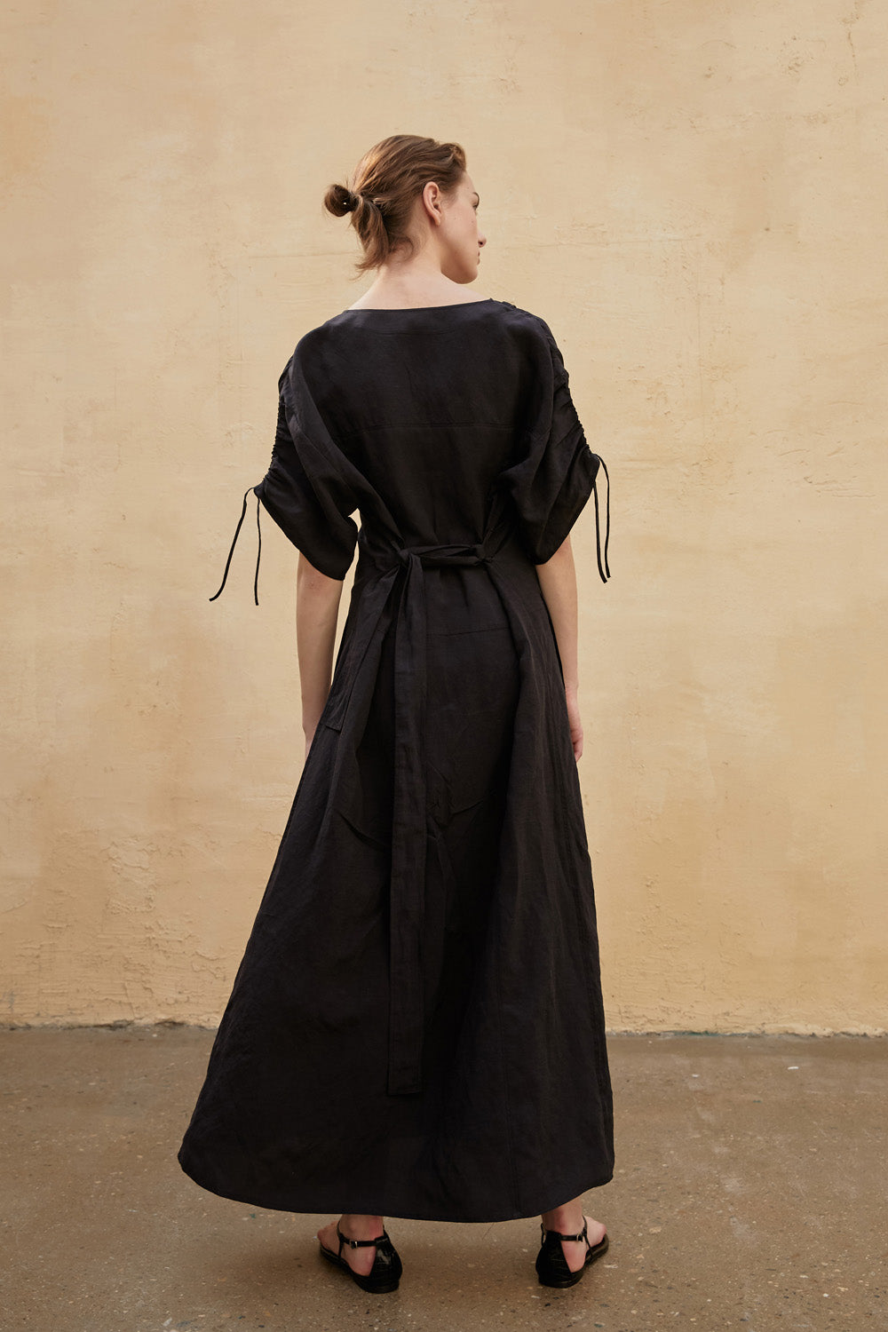 Sarah Luton présente cette robe longue raffinée à col V, confectionnée en lin respirant, conçue pour allier confort et élégance discrète. Dotée de manches ajustables à cordon et de fentes latérales pour une liberté de mouvement optimale, elle crée une silhouette fluide, flatteuse et naturelle. Idéale pour les beaux jours, elle allie confort et sophistication en une seule pièce.