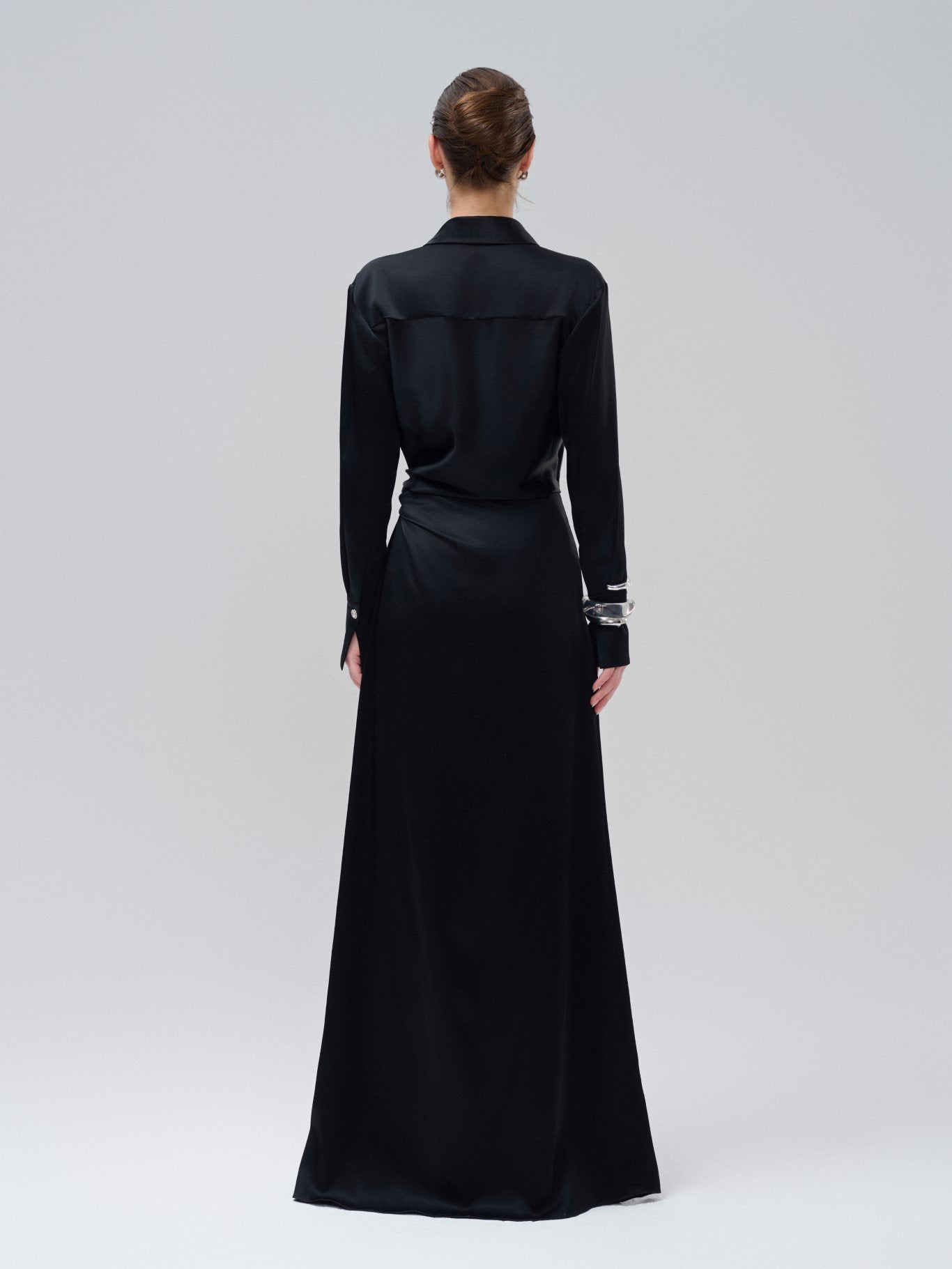 La robe longue en satin Laura Ren apporte une sophistication raffinée aux tenues de soirée modernes grâce à sa silhouette fluide et son drapé brillant. Conçue avec une taille drapée créant un effet cintré naturel, cette pièce longue présente un col et des épaules structurées, lui conférant une silhouette affirmée et féminine. Les poignets boutonnés apportent une élégance raffinée, tandis que les manches longues et le chevauchement sur le devant créent un mouvement gracieux. Associée à des bijoux fantaisie ou à des talons minimalistes, cette pièce se marie parfaitement aux événements formels comme aux réceptions luxueuses.