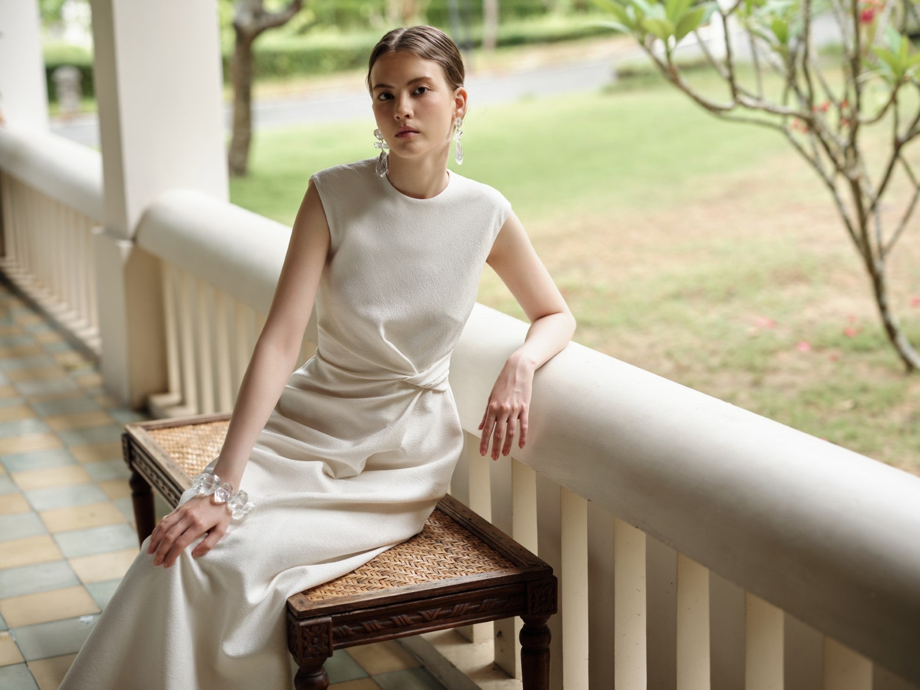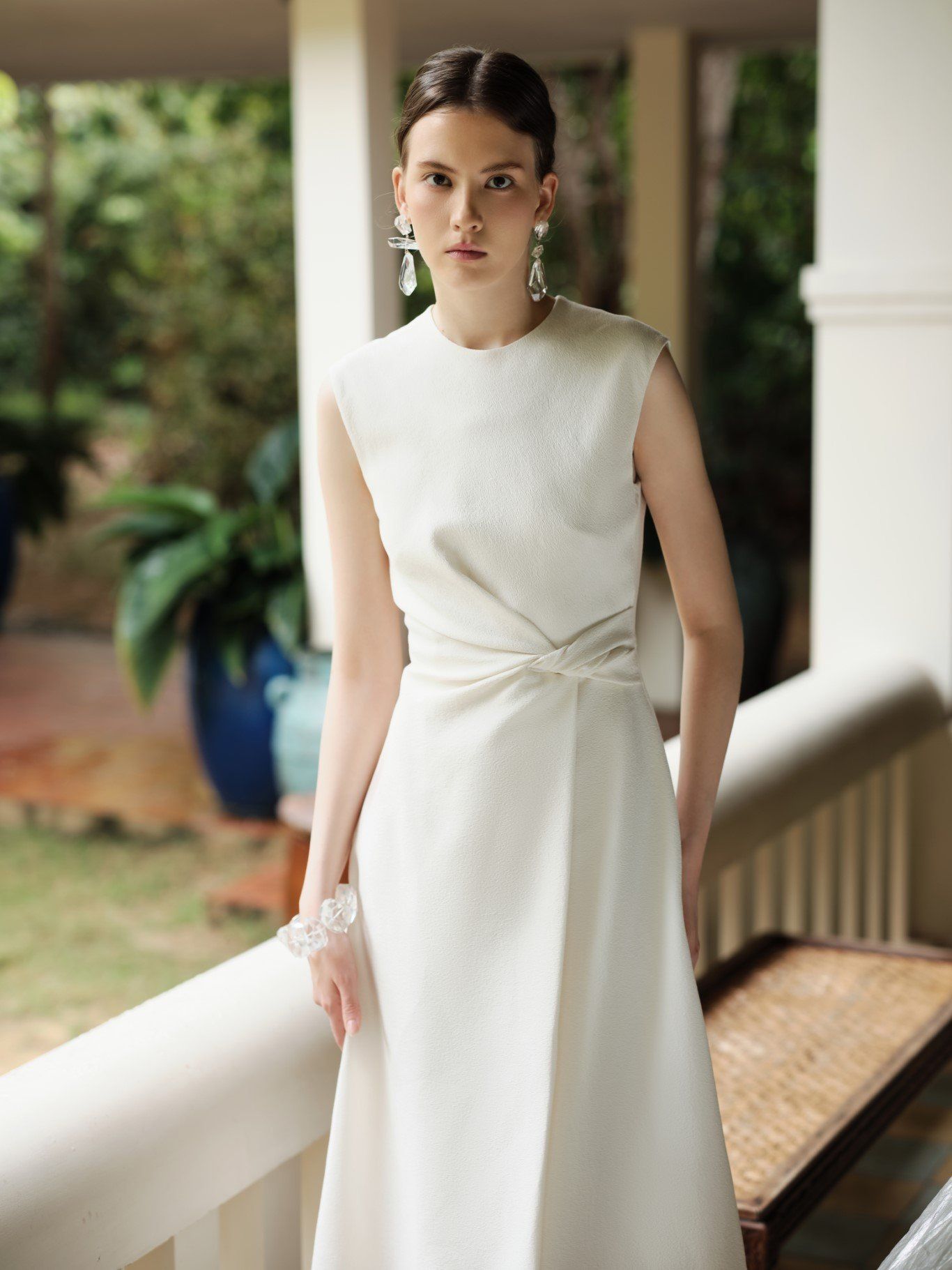 Le minimalisme rencontre l'élégance sculpturale dans cette robe longue sans manches en crêpe signée Laura Ren. Dotée d'un col montant raffiné et d'un détail artistique torsadé sur le côté, sa silhouette épouse délicatement le corps tout en offrant une structure et une fluidité gracieuses. Confectionnée en crêpe texturé, cette robe affiche des lignes épurées avec un drapé en colonne qui tombe jusqu'au sol. Idéale pour les grandes occasions, les événements ou les tenues de mariée modernes, cette pièce Laura Ren incarne une sophistication intemporelle avec une touche contemporaine.