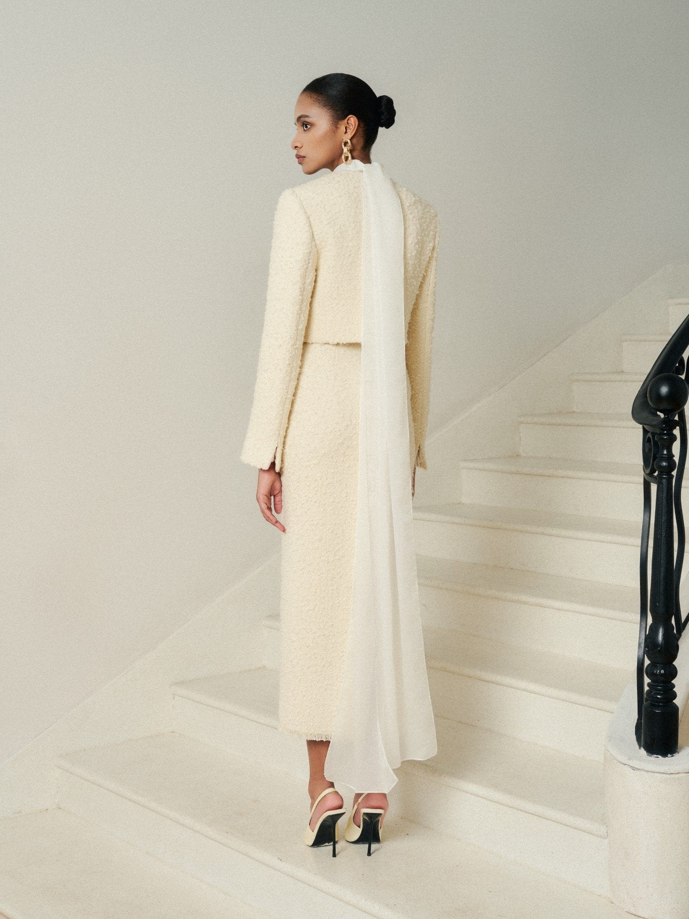 La veste en tweed mélangé de Laura Ren est une expression raffinée du style minimaliste. Dotée d'une encolure sans col sculptée et d'une fermeture épurée sur le devant, cette coupe courte apporte une élégance architecturale à tous les ensembles. Sa composition en tweed subtilement texturé lui confère une dimension riche, tandis que ses manches allongées et sa structure précise lui confèrent une sophistication intemporelle. Conçue pour se superposer facilement à des chemisiers transparents ou s'associer à des jupes coordonnées, cette pièce reflète la fusion signature de Laura Ren entre grâce contemporaine et détails couture. Une veste polyvalente, parfaite pour une tenue de jour raffinée ou une soirée raffinée.