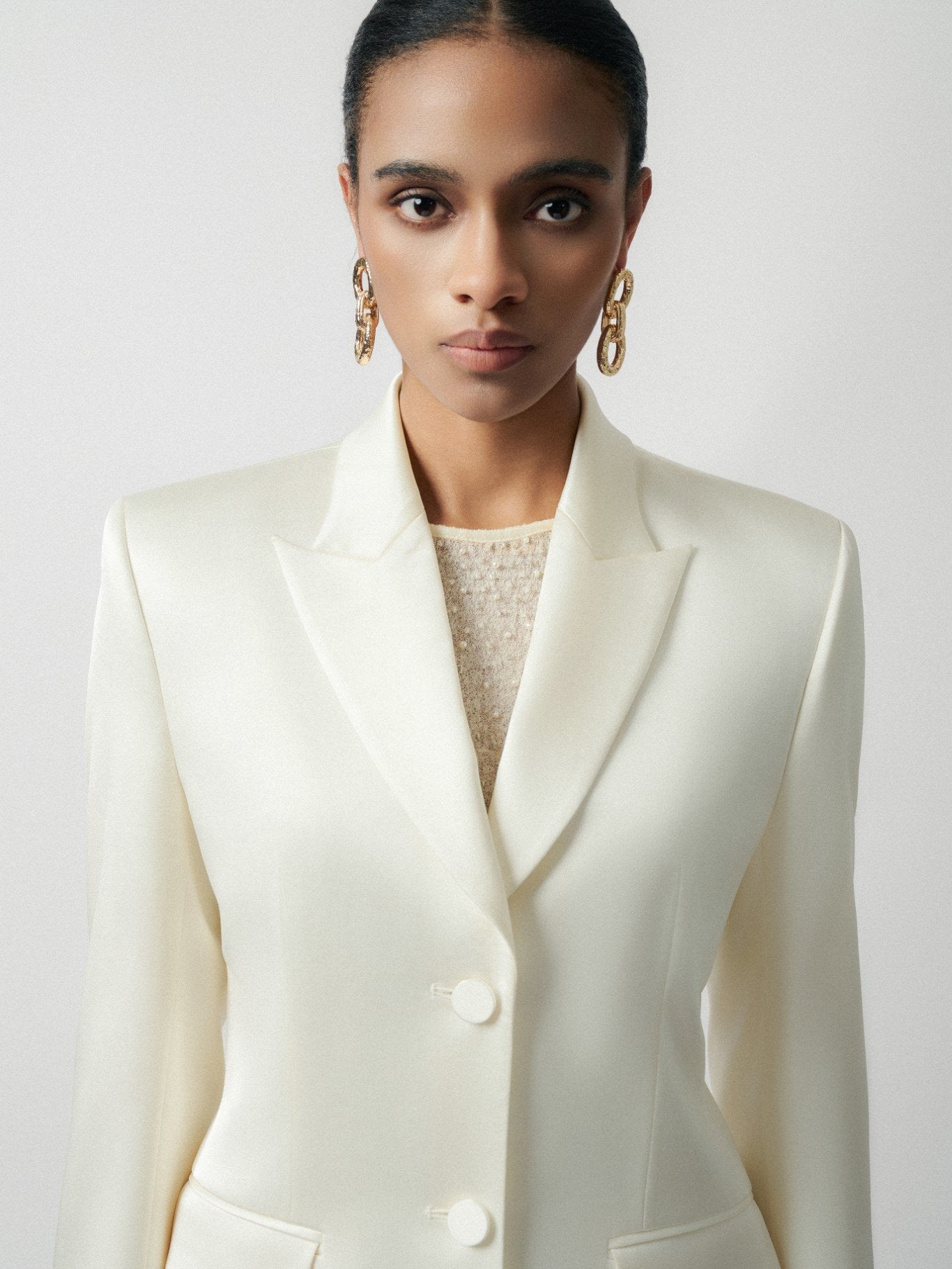 Sublimez vos tenues habillées avec ce blazer en satin sur mesure signé Laura Ren, conçu avec expertise pour une silhouette élégante et sculpturale. Doté d'épaules structurées, de revers crantés classiques et de poches à rabat sur le devant, ce blazer apporte une sophistication intemporelle aux costumes modernes. La fermeture à boutonnage simple et les pinces judicieusement placées soulignent la taille pour une silhouette féminine flatteuse. Porté sur une robe ou avec un pantalon élégant, ce modèle est un incontournable de votre garde-robe. Laura Ren allie coupe minimaliste et textures riches pour une élégance naturelle en toute occasion.