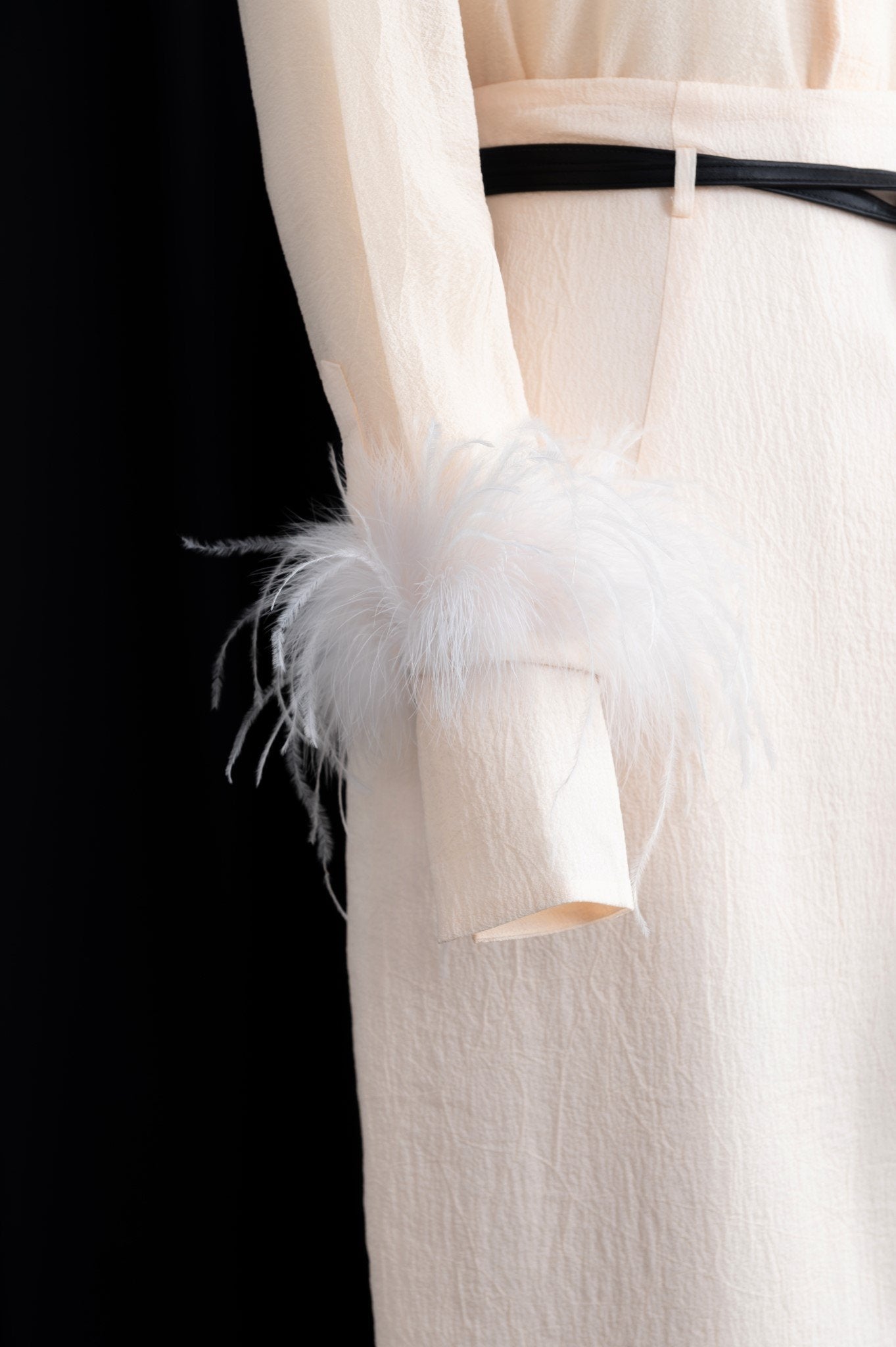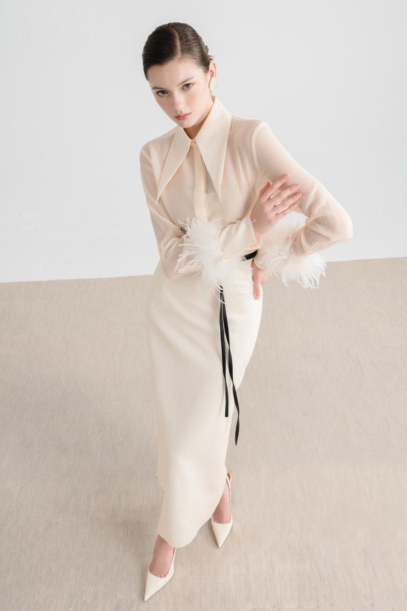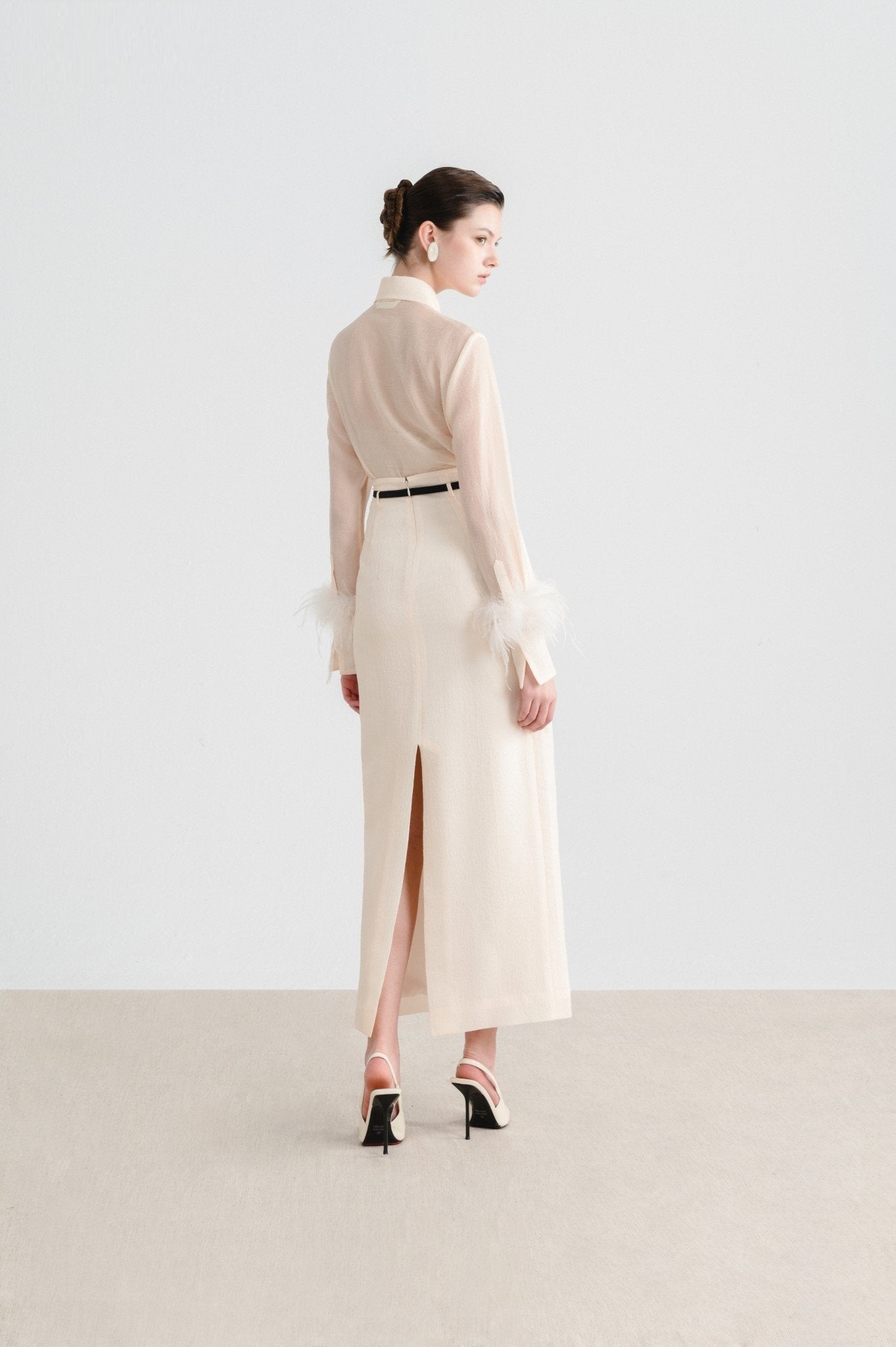 Raffinée et minimaliste, cette jupe midi texturée en laine mélangée offre une silhouette épurée et sculptée, synonyme de luxe discret. Conçue avec une taille haute et une coupe ajustée, elle allonge gracieusement la silhouette tout en offrant une grande liberté de mouvement. Sa longueur midi lui confère une touche intemporelle, idéale aussi bien pour les événements formels que pour un look élégant au quotidien. De délicates bordures en plumes ornent les poignets du chemisier assorti pour un ensemble harmonieux. Une ceinture ton sur ton élégante, rehaussée d'une ceinture contrastante, apporte une touche structurée à la tenue. Parfaite pour les femmes modernes à l'esthétique soignée, cette jupe Laura Ren est un ajout élégant à toute garde-robe.