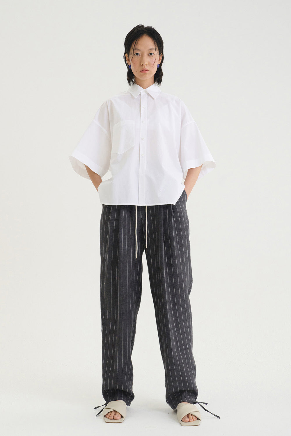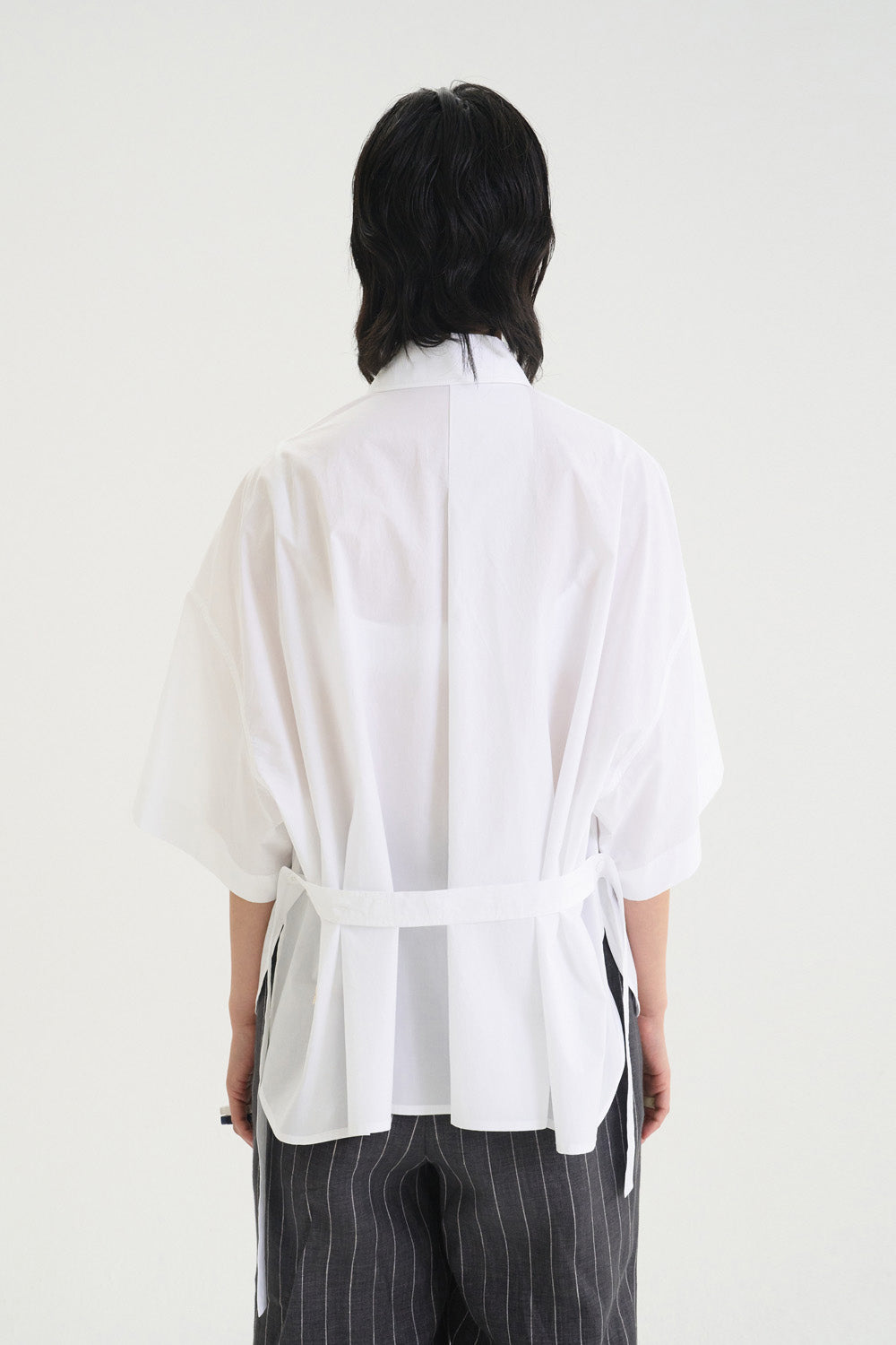 The Sarah Luton linen and cotton poplin shirt is a refined take on effortless tailoring. Crafted from a breathable blend of natural fibers, this piece combines the crisp structure of cotton poplin with the softness of linen for all-day comfort. The oversized silhouette features wide short sleeves, a sharp collar, and a single front pocket for a contemporary edge. A unique back tie detail adds shape and styling versatility, making it easy to wear tucked, loose, or cinched. Perfect for elevating your everyday wardrobe, this shirt is designed for timeless ease and modern layering. A true essential for discerning wardrobes.