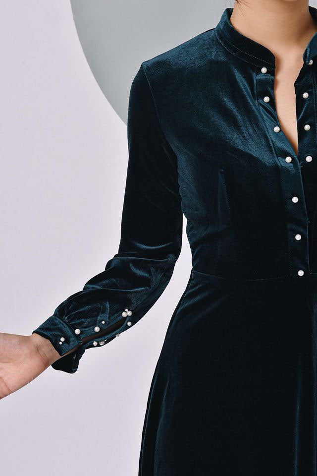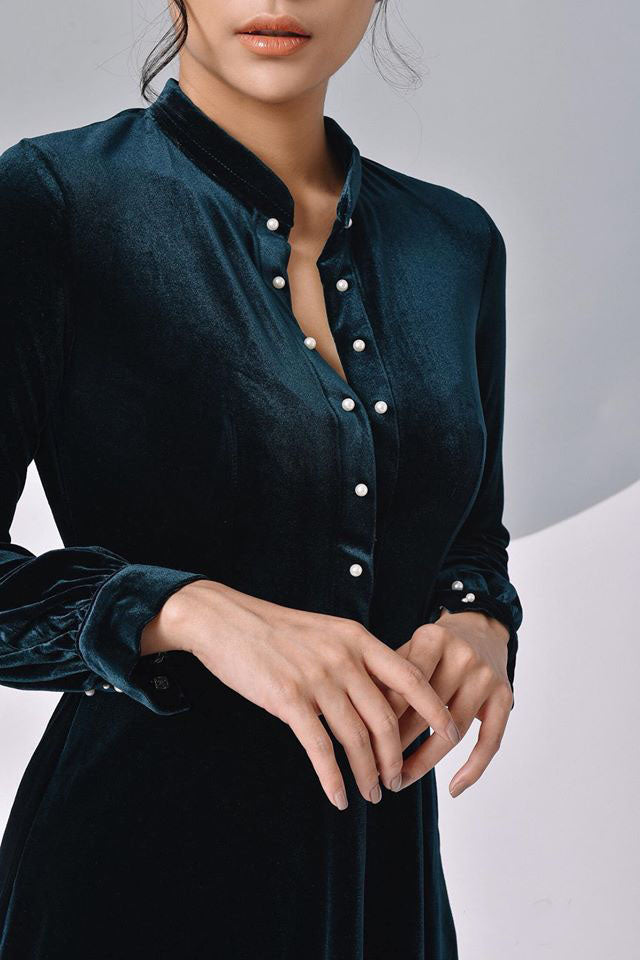 Step into timeless elegance with this velvet midi dress by Laura Ren. Crafted from soft, plush velvet, this button-down silhouette features a refined high collar and delicate pearl buttons that run along the front placket and cuffs. The tailored fit gently flares at the hem for graceful movement, while the long sleeves and structured shape make it ideal for both daywear and refined evening looks. Whether paired with heels or boots, this velvet dress adds a rich texture and polished charm to any wardrobe.