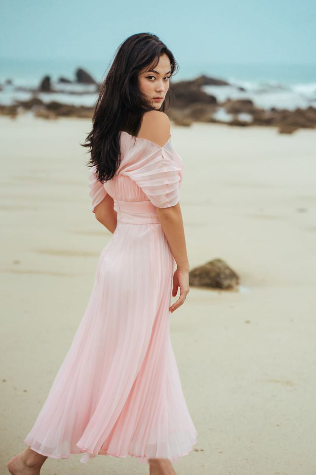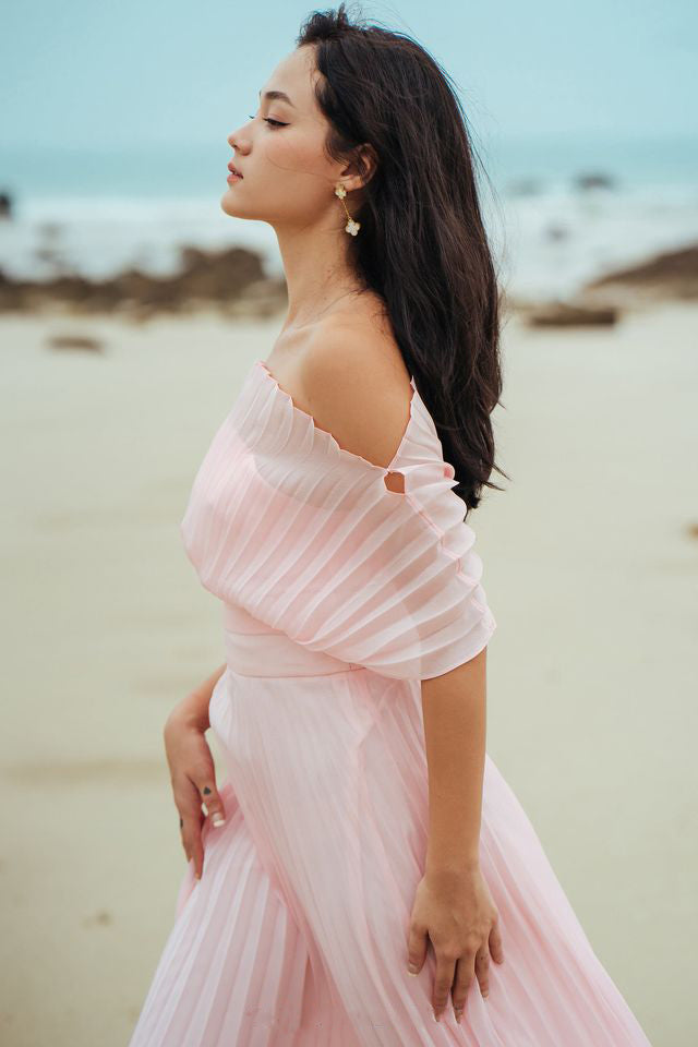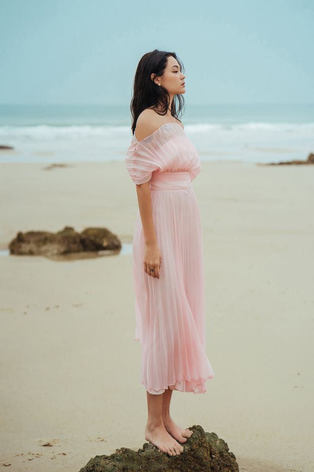 This ethereal organza midi dress by Sarah Luton is a perfect blend of refined structure and delicate flow. Featuring a pleated texture throughout, the dress offers a sculpted silhouette with soft movement. The off-shoulder neckline adds a romantic touch, while the elastic waistband ensures a comfortable, flattering fit. Crafted from sheer organza for a light and airy finish, this dress is ideal for seaside occasions, resort wear, or elevated summer gatherings. A timeless piece that brings graceful femininity to your wardrobe.