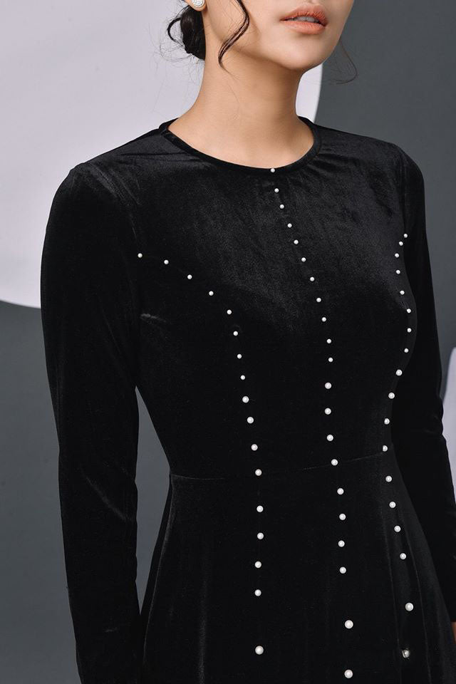This stunning velvet evening dress from Laura Ren brings refined elegance to any occasion. Designed with a figure-skimming silhouette, it features delicately placed pearl embellishments that elongate the body and add a touch of classic sophistication. The long sleeves and full-length hem offer graceful coverage, while the soft velvet fabric drapes beautifully to highlight every movement. Perfect for formal events, this design blends timeless charm with modern refinement, making it a standout piece in any wardrobe. Elevate your eveningwear with this impeccably tailored velvet dress by Laura Ren.