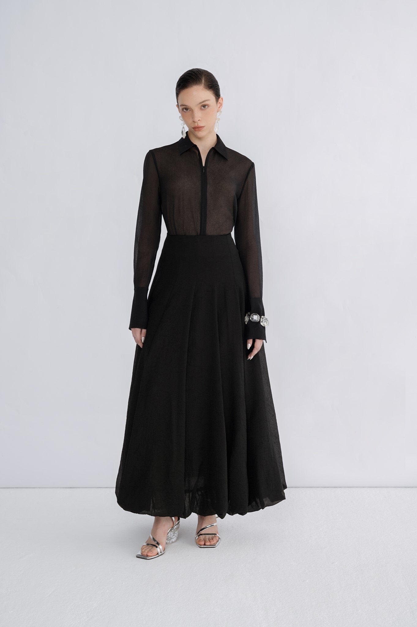 The Laura Ren flared linen skirt is a refined expression of fluid tailoring and soft structure. Crafted to sit high on the waist, the design flows into a voluminous full-length silhouette that moves gracefully with every step. A semi-sheer finish and understated pleats lend lightness and sophistication, perfect for both occasion dressing and elevated everyday wear. Designed to pair seamlessly with structured blouses or sheer tops, this skirt offers timeless appeal rooted in effortless elegance. Let the Laura Ren aesthetic elevate your modern wardrobe.