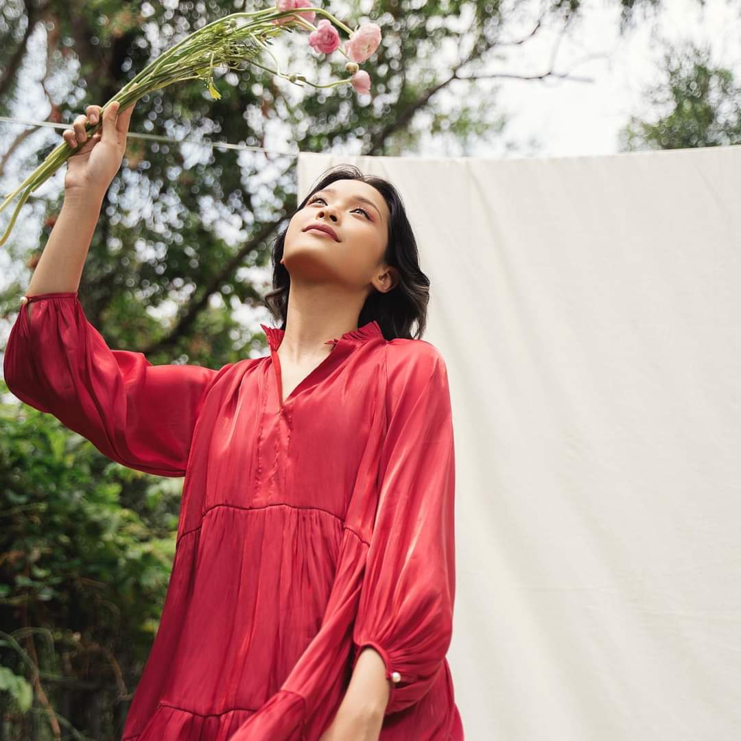 Effortlessly chic and fluid, this silk mini dress from Sarah Luton captures the essence of relaxed elegance. Designed with soft tiers that create graceful movement and subtle volume, the silhouette flatters with its airy structure and lustrous finish. The three-quarter balloon sleeves, gathered at the cuffs, add a romantic, bohemian touch, while the gentle V neckline elongates the form. Whether styled with flats for daytime ease or heels for evening charm, this piece is a versatile standout in any luxury wardrobe. Crafted in premium silk, it offers unmatched softness and sheen.