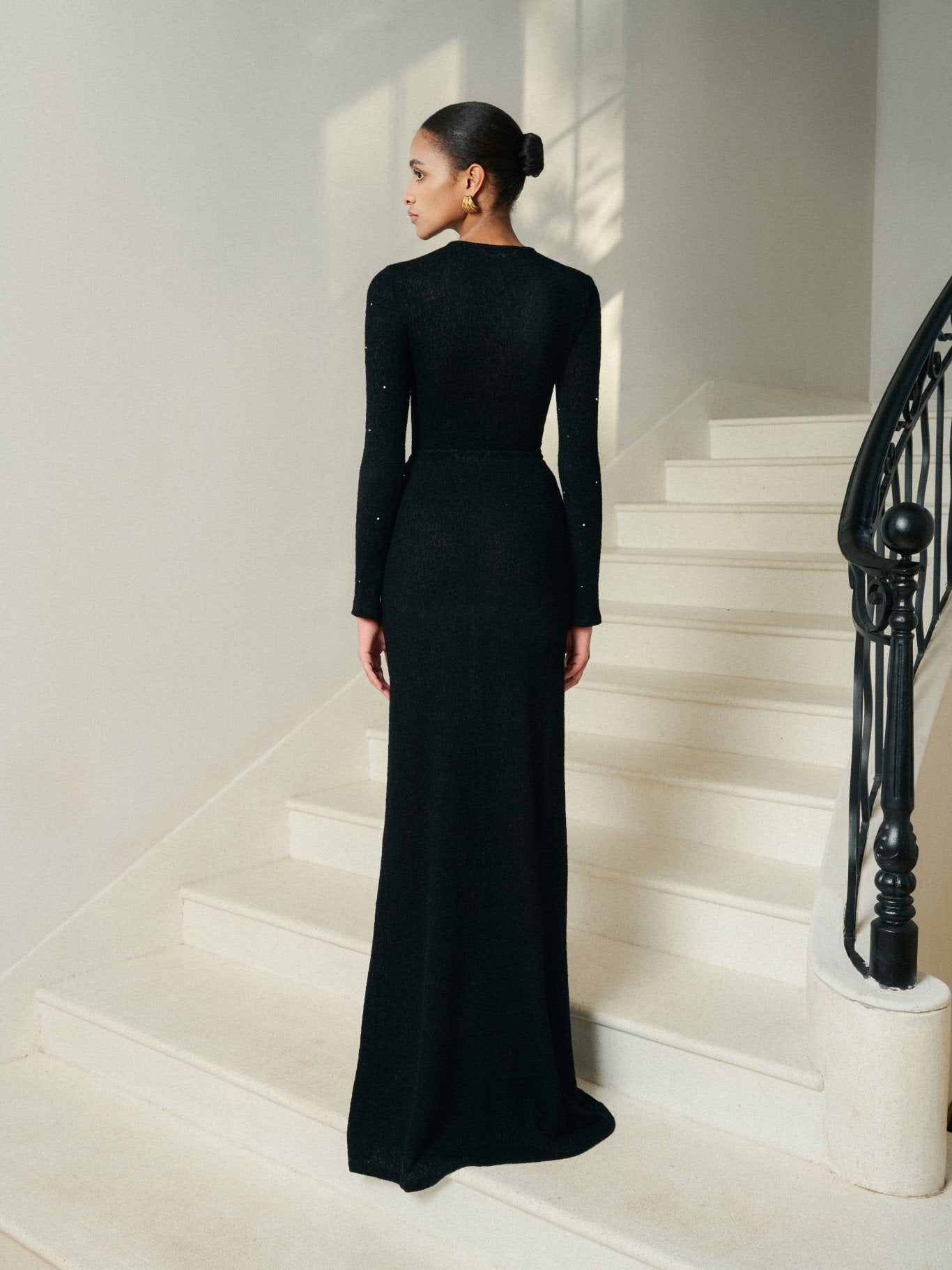 A striking full-length evening dress from Laura Ren that balances elegance with subtle sparkle. Crafted for timeless appeal, this design features a figure-enhancing cut, long sleeves, and a round neckline. Delicate embellishments radiate across the bodice, adding texture and brilliance without overwhelming the sleek silhouette. Perfect for formal events, this gown is designed to leave a lasting impression. Elevate your eveningwear collection with this refined Laura Ren creation.