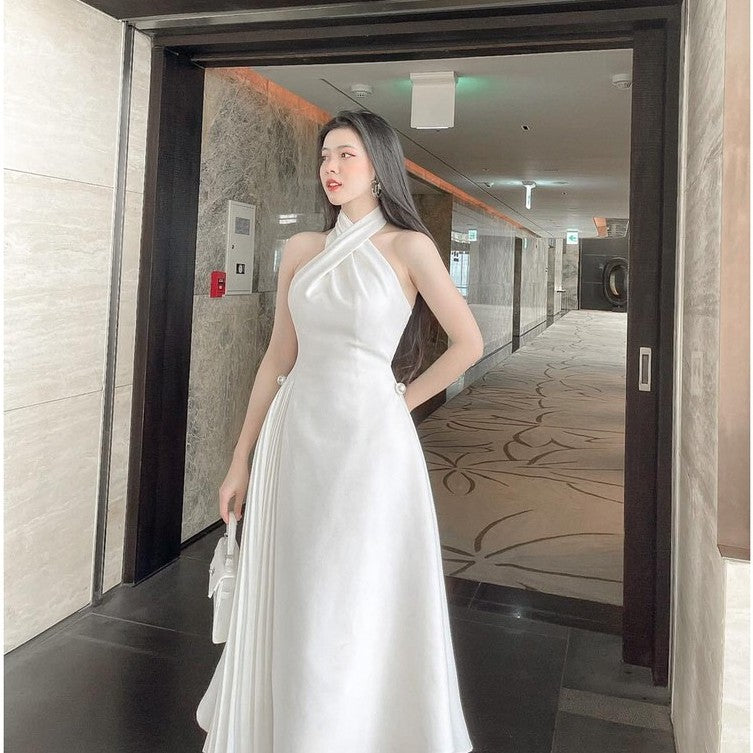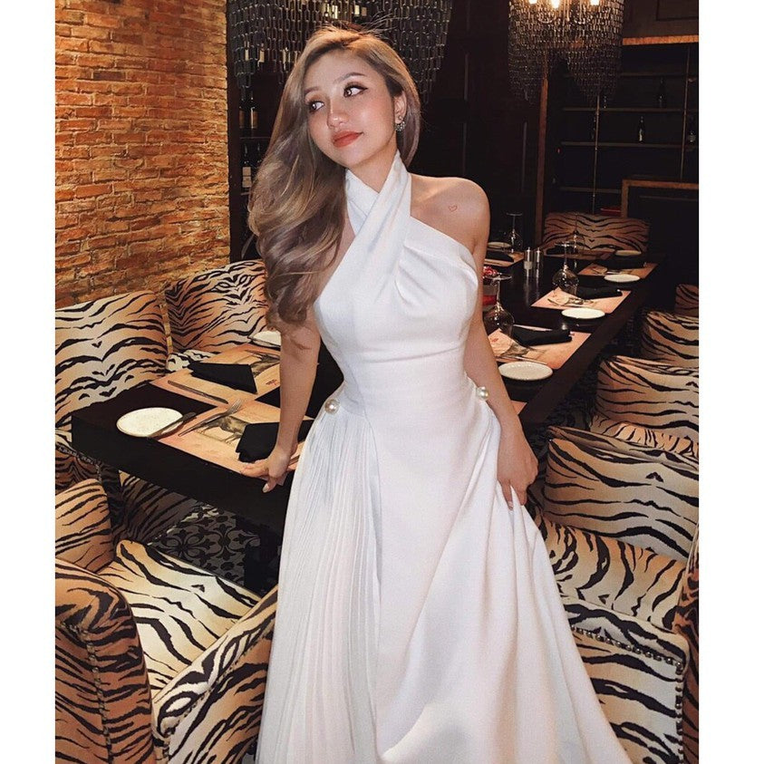 This elegant silk midi dress from Sarah Luton is designed to turn heads with its refined crossover halter neckline and luxurious pleated side skirt. Crafted from premium silk, the dress features a sculpting waistline accented with statement pearl buttons for a touch of sophistication. The flowing A-line silhouette moves effortlessly, making it perfect for formal dinners, weddings, or high-profile events. The unique halter cut highlights the shoulders while offering timeless grace and modern appeal. A standout piece in any wardrobe, this dress blends craftsmanship and style for the ultimate feminine statement.