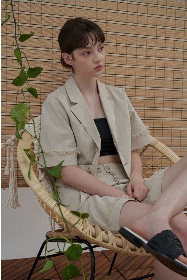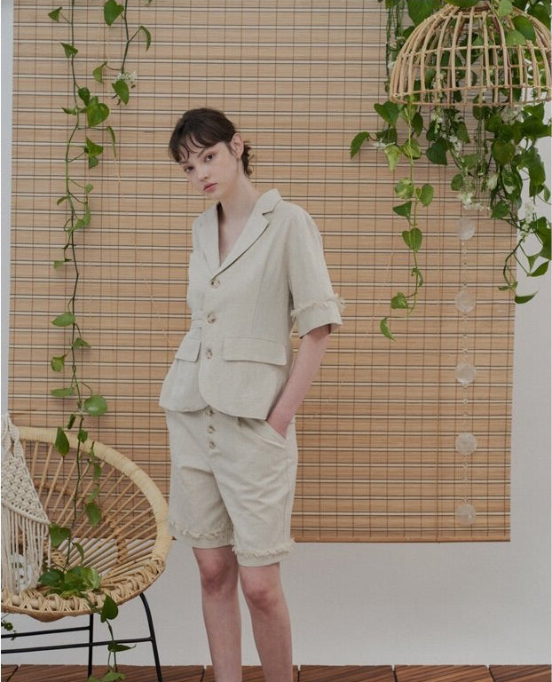 Sarah Luton introduces these effortlessly chic high-waisted linen shorts, crafted for refined warm-weather styling. Tailored from breathable natural linen, they feature a front button placket, subtle raw-edge hem, and a relaxed fit that flatters without compromising comfort. Ideal for pairing with structured blazers or breezy summer tops, these shorts bring an air of casual sophistication. The slightly elongated length adds both ease and elegance, perfect for both leisure and resort wear.