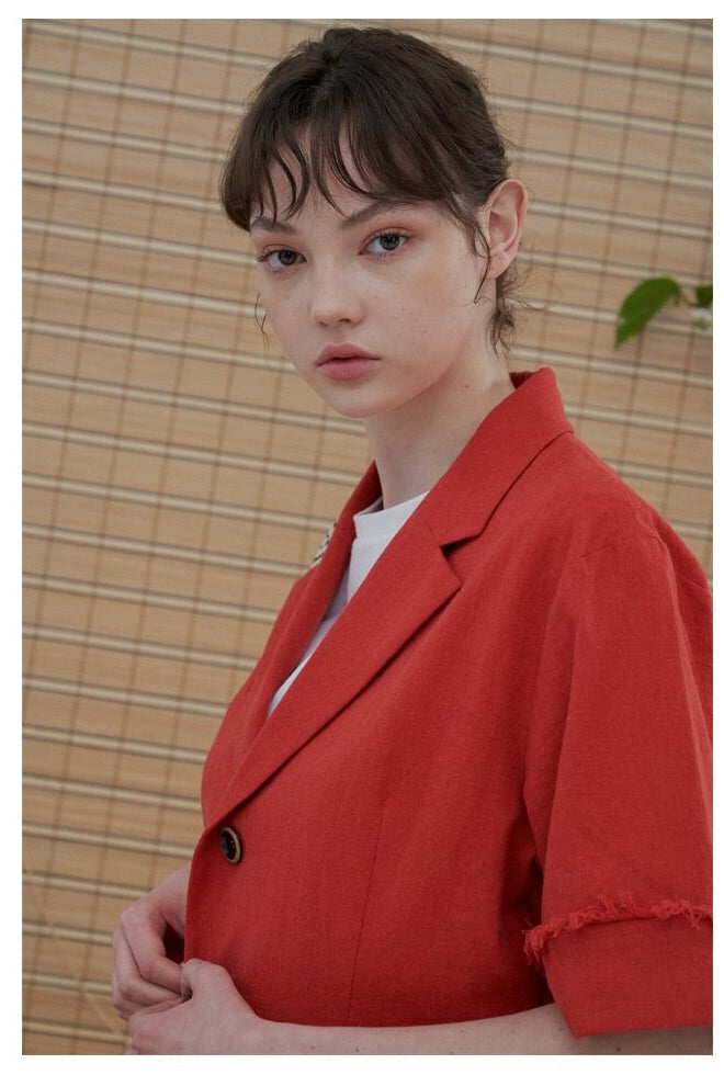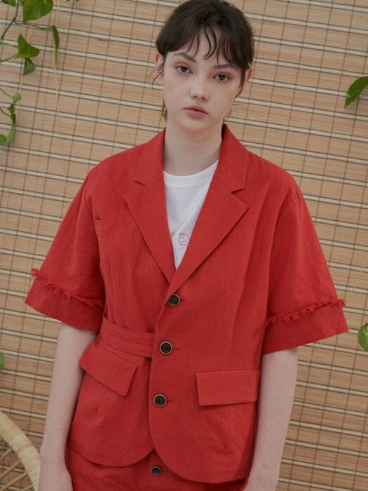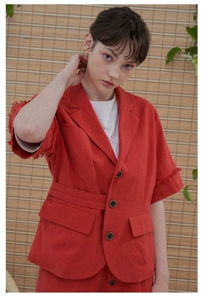 Sarah Luton presents a tailored linen blazer that blends structure and ease for the modern woman. Designed with a sharp notched lapel and short sleeves, this piece features a subtle frayed hem on the cuffs and a belted waist to accentuate the silhouette. The breathable linen fabric ensures comfort, while oversized patch pockets add a utilitarian edge. Perfect for pairing with matching shorts or elevating casual looks, this blazer transitions seamlessly from daywear to evening style.