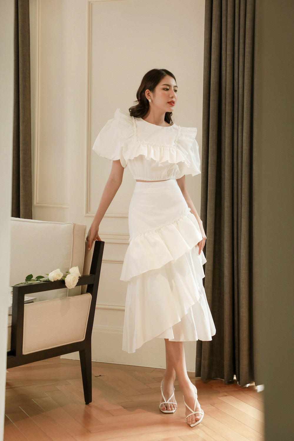 Elevate your occasionwear with this romantic chiffon organza skirt from Sarah Luton. Crafted from airy, semi-sheer chiffon organza, the design showcases a flattering high-rise waistband and tiered ruffle layers that cascade into an asymmetric hem. The voluminous silhouette adds graceful movement with every step, while the clean structure creates an effortlessly refined aesthetic. Whether paired with its matching crop top or styled separately, this skirt brings elegance and femininity to your wardrobe. A timeless piece that blends statement design with ethereal charm—perfect for garden parties, special events, or elevated everyday looks.