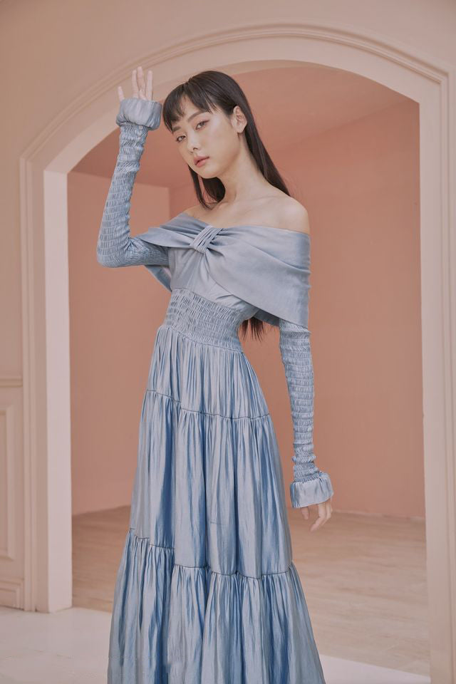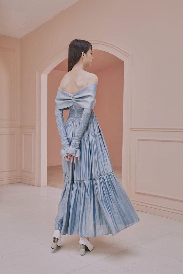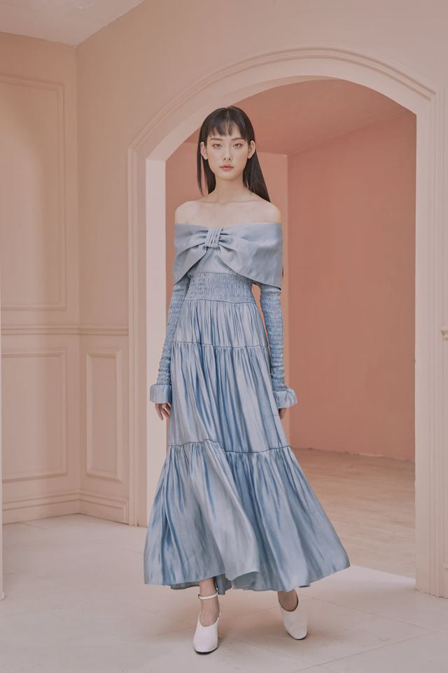 Indulge in luxury with our Leanne Long Sleeve Bardot Bow Detail Tiered Maxi Dress. This stunning piece features delicate bow details and tiered layers, exuding sophistication and elegance. The long sleeves add a touch of warmth, making it perfect for any special occasion. Elevate your wardrobe with this exclusive dress.