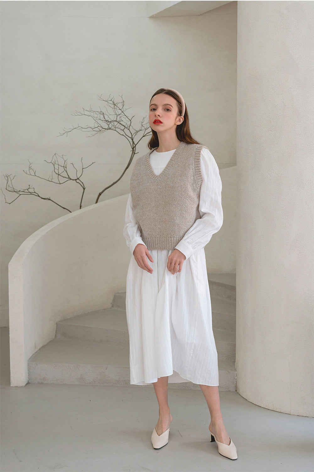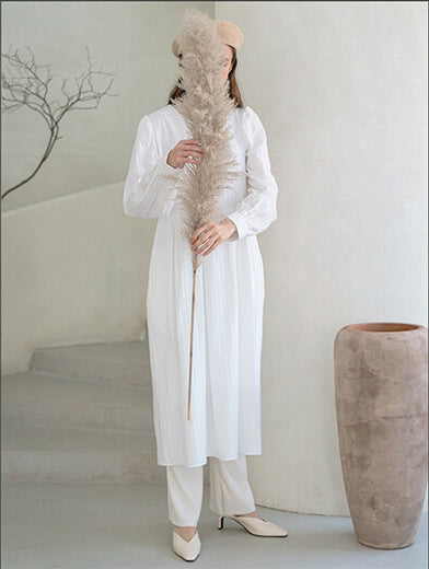 This linen midi dress by Sarah Luton channels timeless elegance with a modern, romantic silhouette. Featuring a round neckline, subtle vertical texture, and softly gathered waist, it flatters the figure while maintaining a relaxed, breathable fit. The long sleeves are gently puffed and finished with refined cuffs, creating a graceful balance between structure and softness. Made from a lightweight linen blend, this piece is ideal for layering over trousers or wearing solo for an airy, feminine look. A wardrobe essential that effortlessly transitions between seasons.