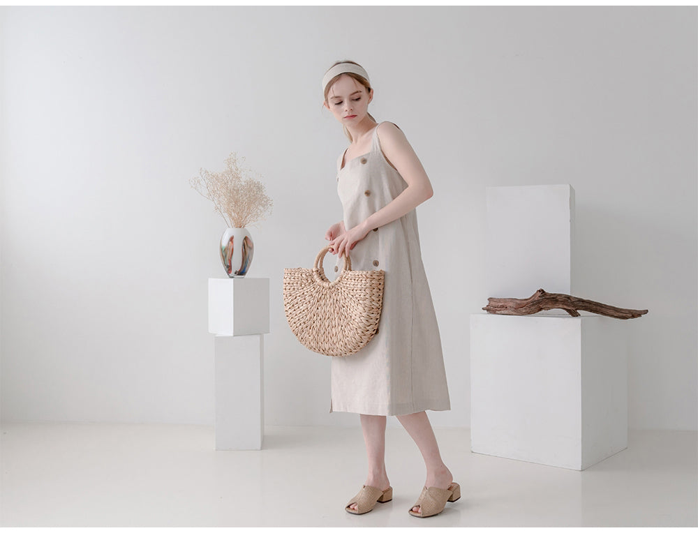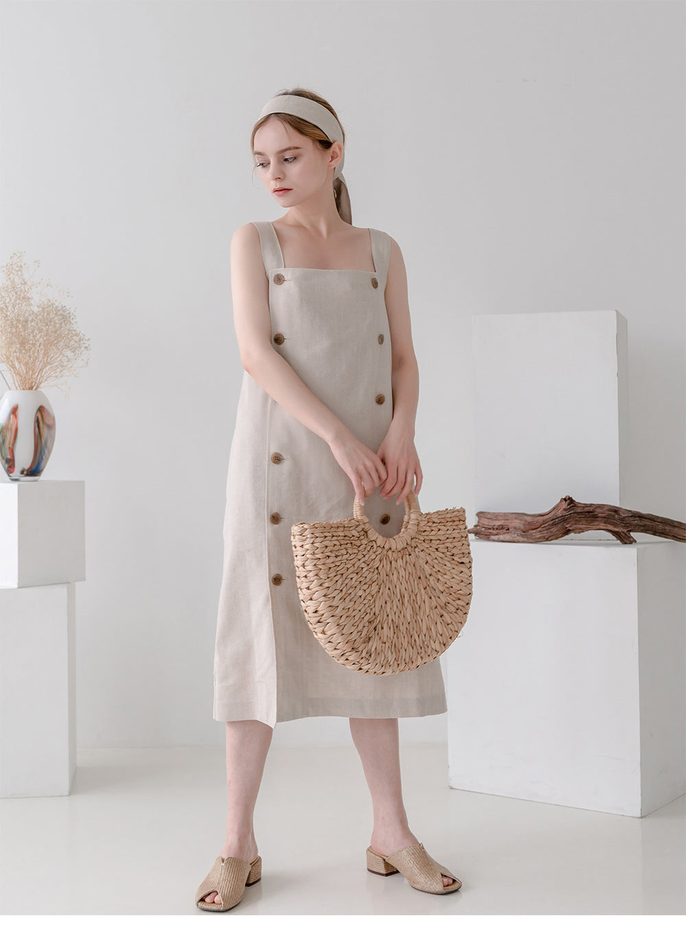 Sarah Luton presents this effortlessly chic linen midi dress, tailored from breathable natural fibers for refined everyday elegance. Featuring wide shoulder straps and an asymmetrical double-breasted button front, this piece flatters with a softly structured silhouette perfect for warm-weather styling. The linen fabric ensures comfort and coolness, while the minimal design makes it versatile enough to dress up or down. Ideal for relaxed outings or resort-ready looks, it blends timeless style with understated sophistication.