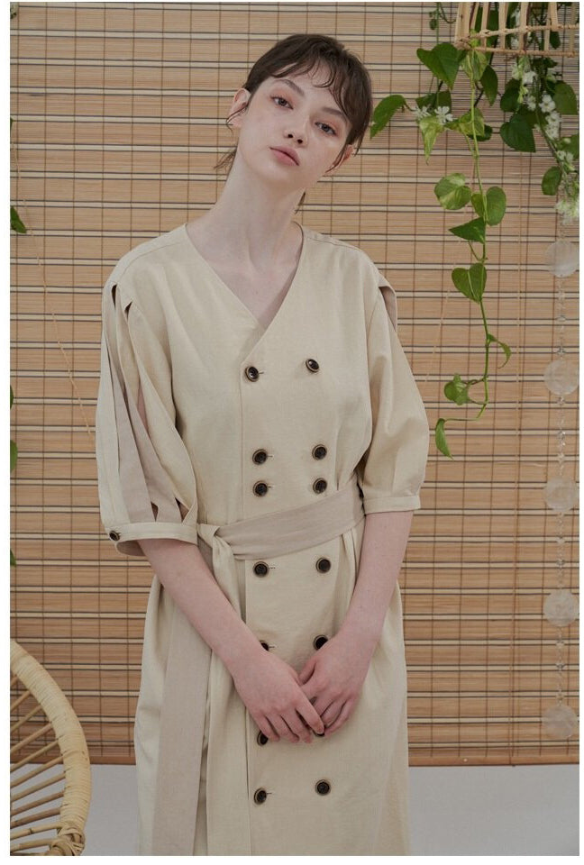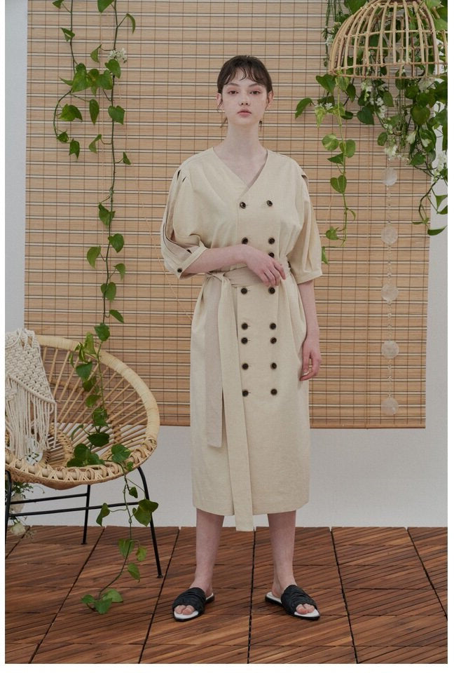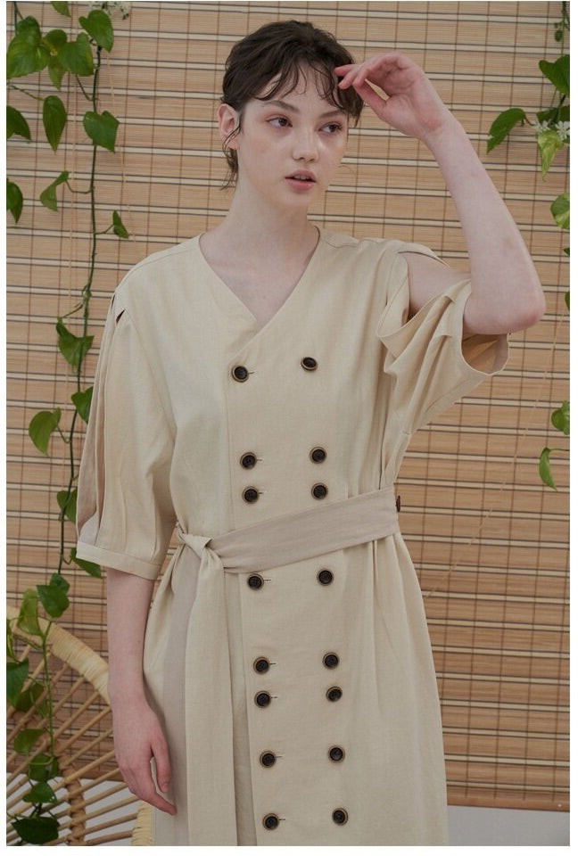 Sarah Luton presents a refined linen midi dress that merges timeless tailoring with soft, modern ease. Designed with a relaxed silhouette and elevated by dramatic slit sleeves, this dress features a flattering V-neckline and double-breasted button detailing for a polished finish. The matching waist belt defines the figure while offering styling versatility. Crafted from breathable linen, it’s perfect for warm-weather occasions or effortless day-to-evening transitions. A wardrobe essential that balances elegance and ease.
