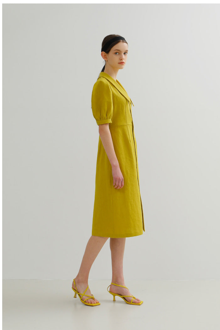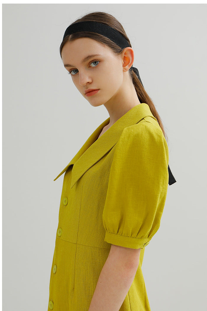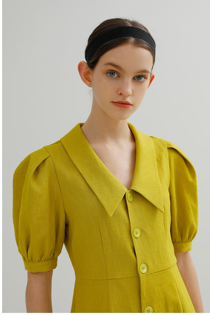 Sarah Luton presents this elegant linen midi dress, crafted to enhance your everyday sophistication. Designed with a flattering A-line silhouette, it features a sharp wide collar, statement puff sleeves, and a front button-down closure for timeless appeal. Breathable and structured, the pure linen fabric ensures comfort and effortless style in warmer seasons.
