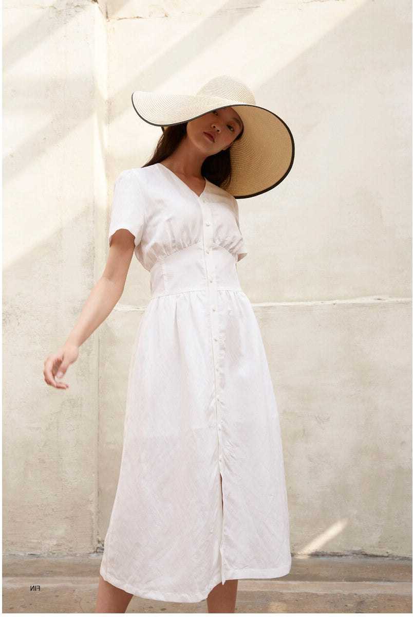 Sarah Luton introduces this effortlessly elegant linen midi dress, featuring a soft V-neckline, short sleeves, and a clean button-down front. Made from breathable linen fabric, it flatters the waist with gentle gathering and a fitted midsection. The unexpected cut-out detail at the back adds a modern, breezy twist to the classic silhouette. Whether styled for a coastal getaway or summer in the city, this dress offers the perfect blend of timeless ease and contemporary charm.