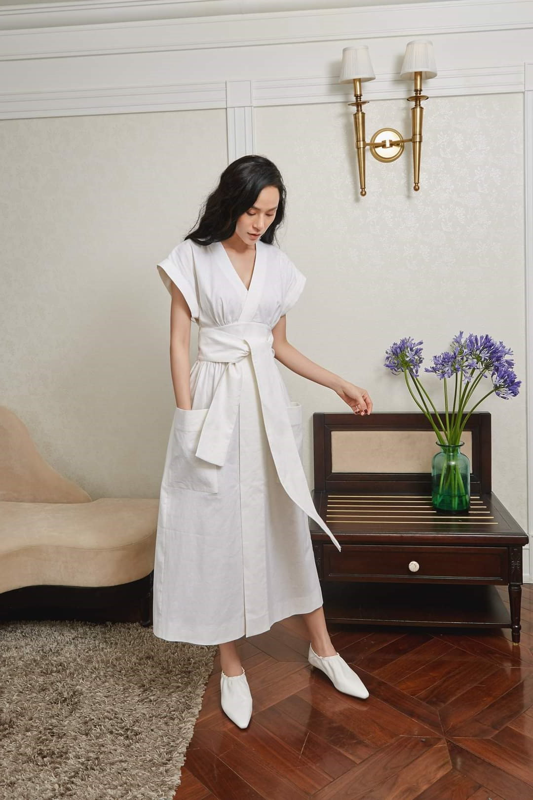 This linen midi dress from Sarah Luton combines effortless style with thoughtful design. Crafted from breathable linen, it features a flattering V-neckline, wide cap sleeves, and an adjustable waist tie that enhances the silhouette. The oversized patch pockets offer both function and a modern touch, making it perfect for versatile daywear. Whether worn to a weekend brunch, summer outing, or casual gathering, this piece delivers understated sophistication and comfort in every setting.