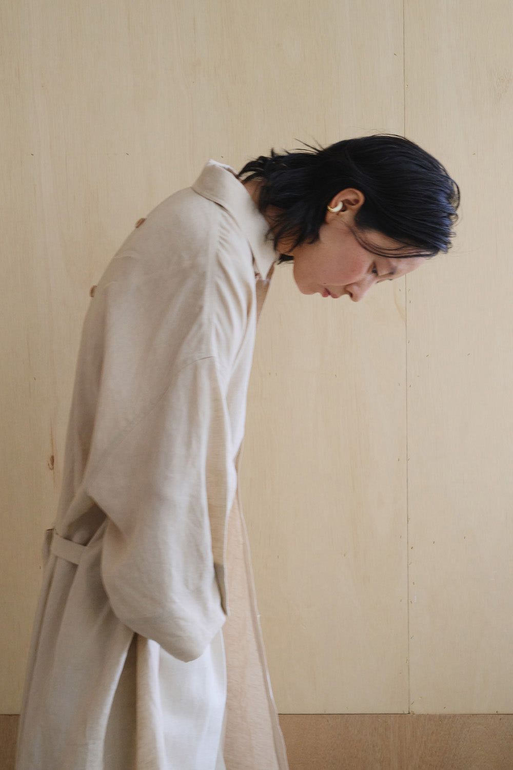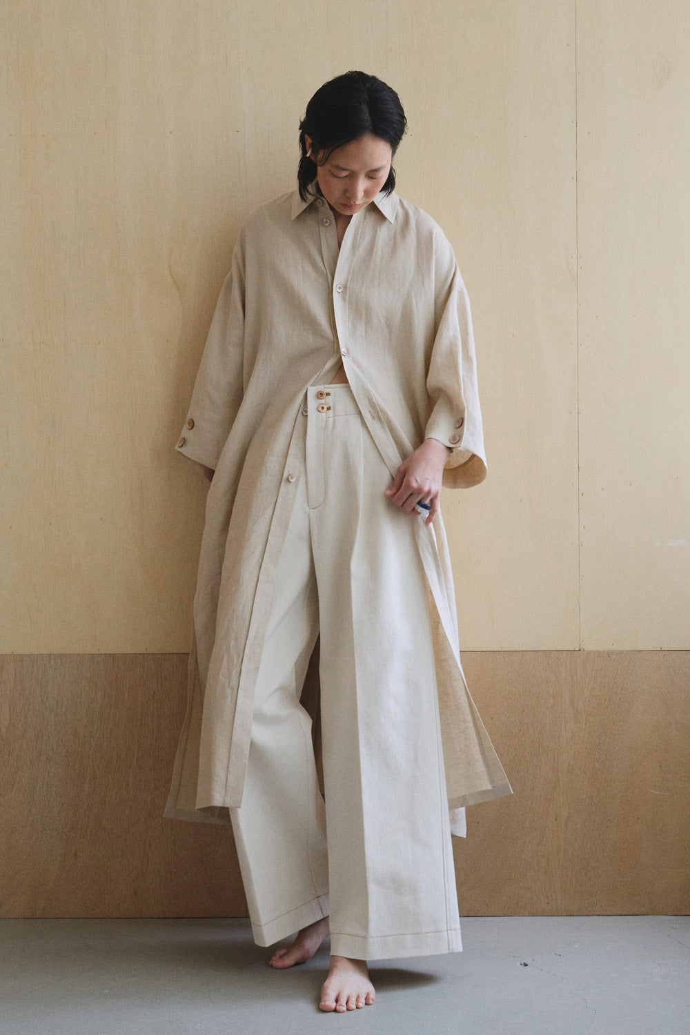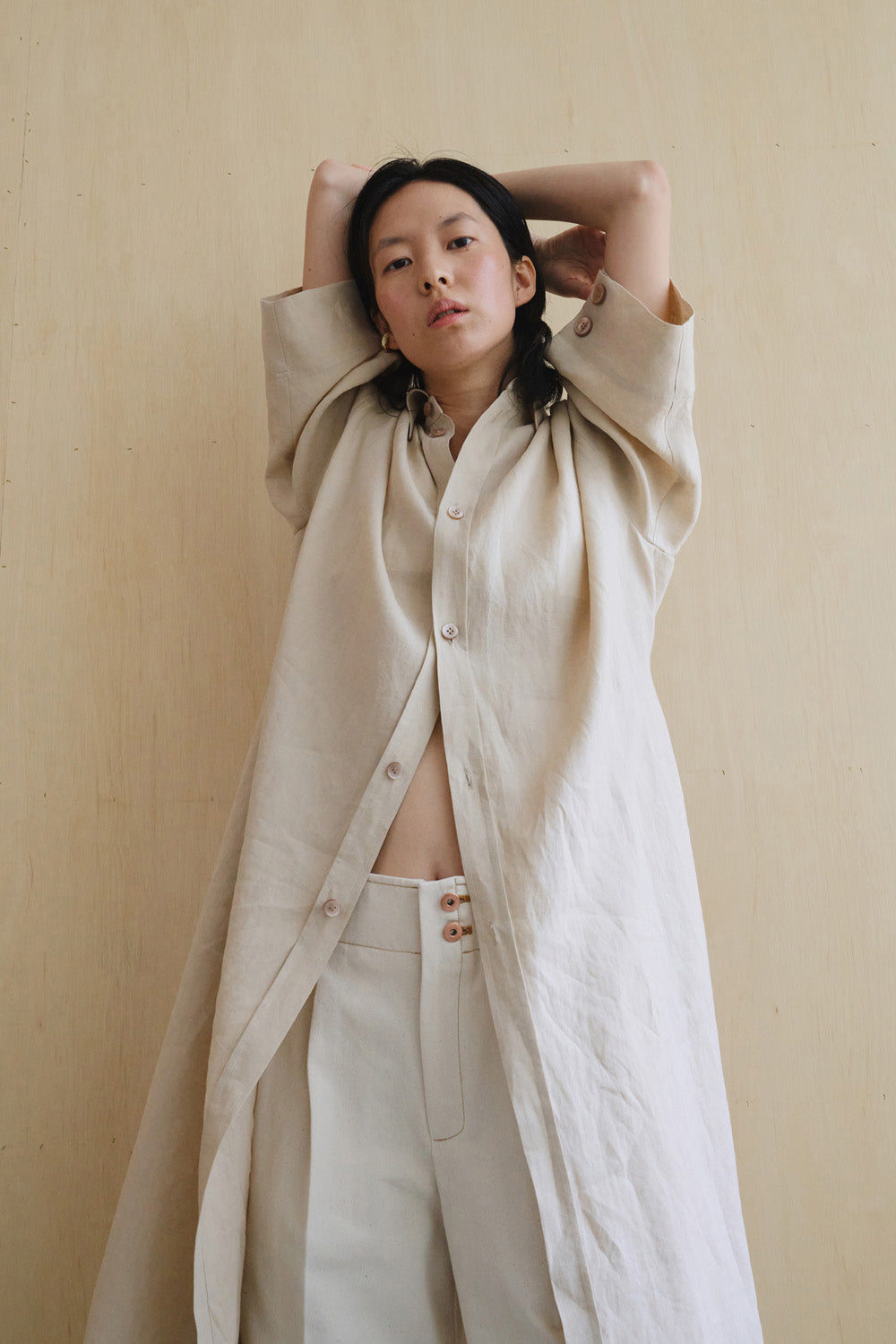 This linen jacket by Sarah Luton offers a sculptural, contemporary silhouette with minimalist appeal. Designed in a soft linen blend, the longline shape features a clean front placket, dropped shoulders, and side slits for movement. The standout detail is the button-back closure, offering a refined twist on traditional outerwear. Lightweight and breathable, it works beautifully as a layering piece for transitional weather. The relaxed fit and flowing drape make it a versatile staple for understated, elevated dressing.