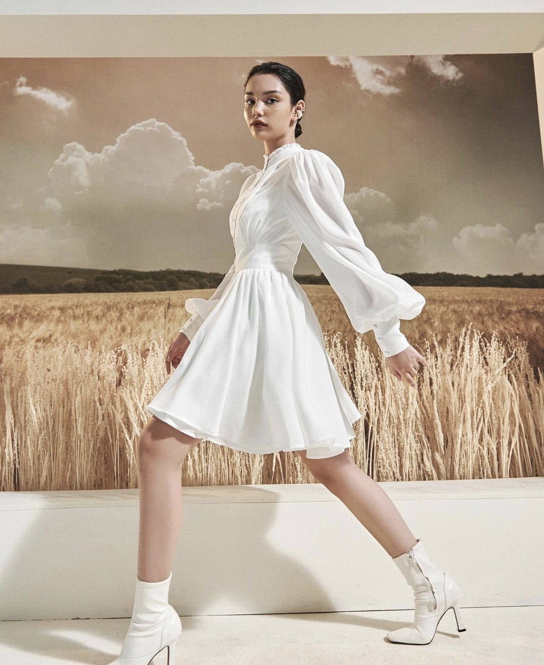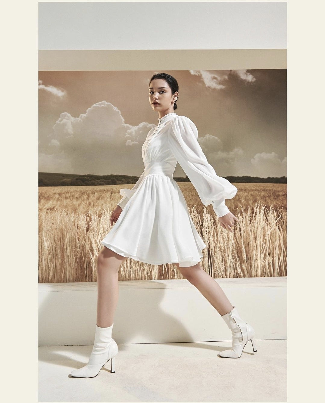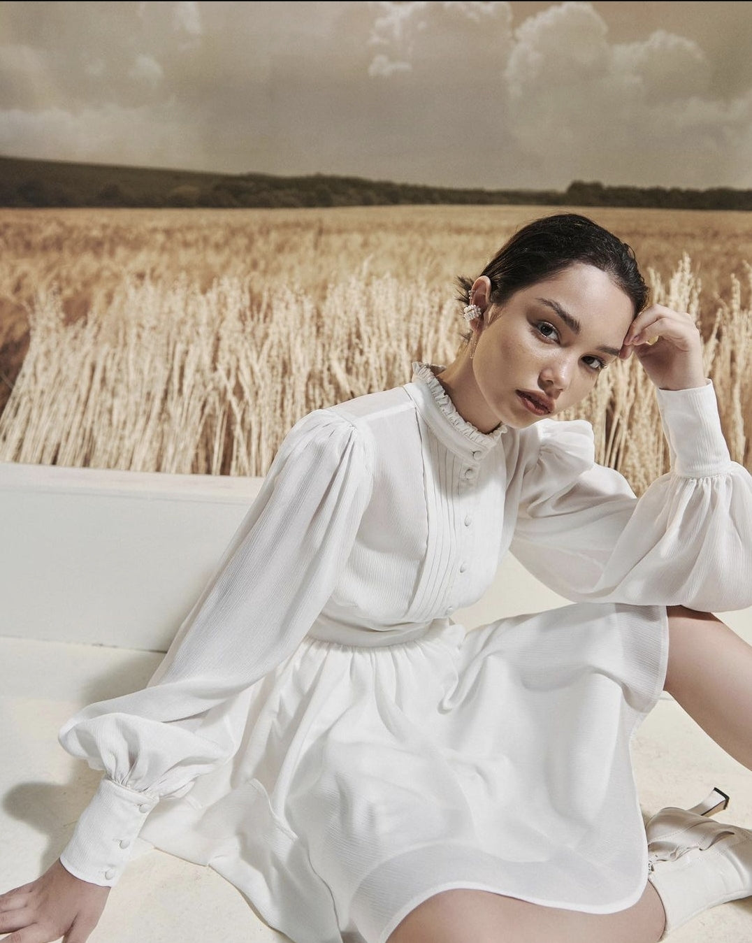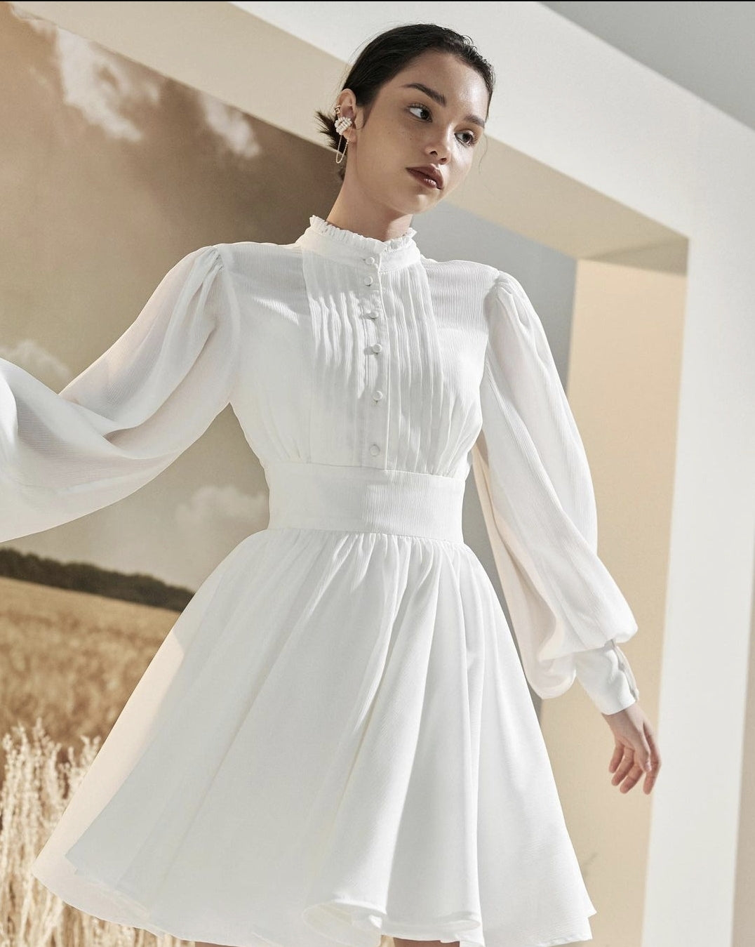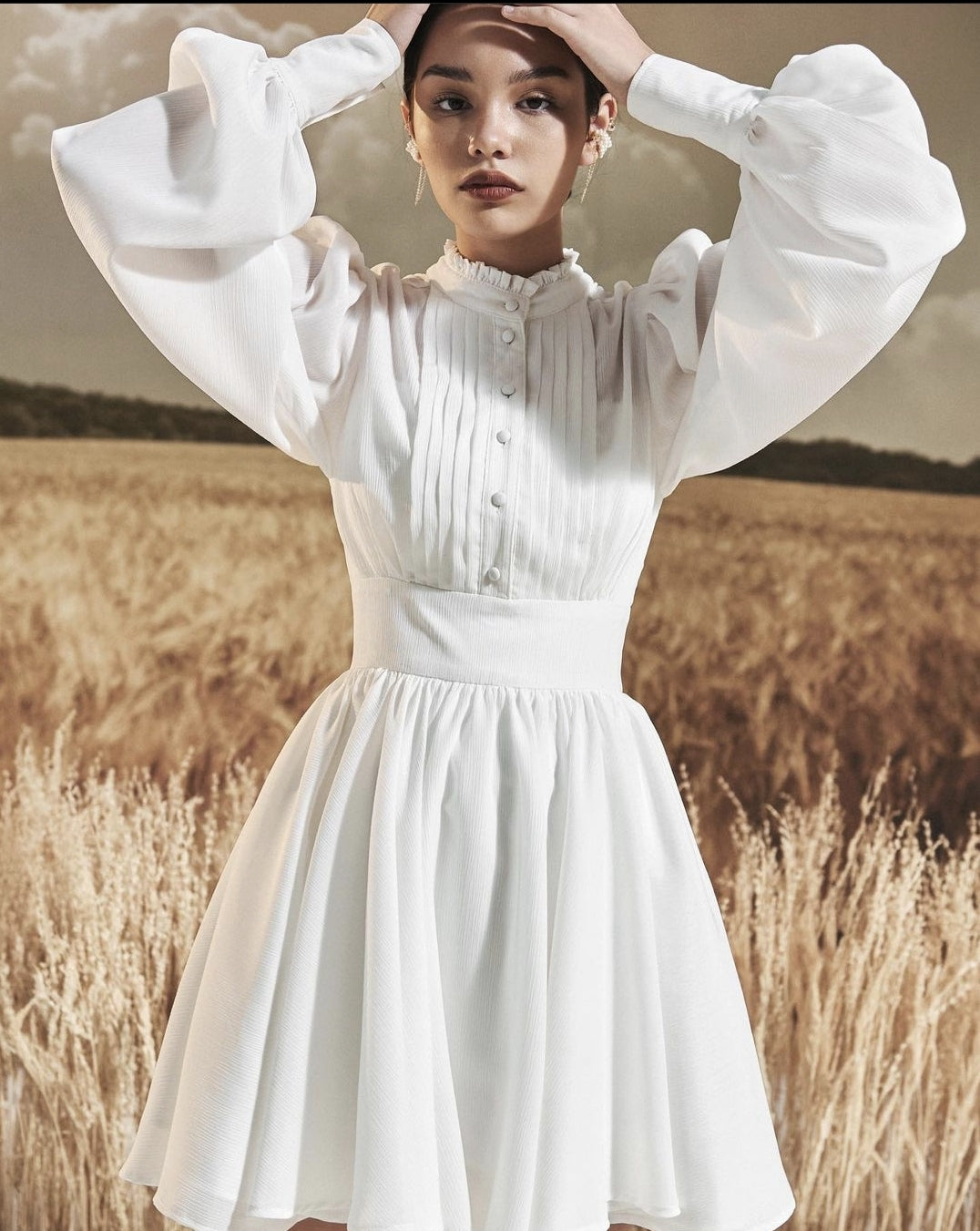 This mini silk dress from Sarah Luton blends timeless sophistication with playful charm. Crafted from smooth, lightweight silk, it features a delicately structured bodice with fine pleats, voluminous lantern sleeves, and a high neckline with soft ruffle detail. The wide, cinched waistband creates a flattering silhouette, while the flared skirt adds feminine movement with each step. Designed to command attention in any setting, this dress is perfect for elegant daytime occasions or elevated evenings out. Sarah Luton brings modern elegance to life with every luxurious detail in this piece.