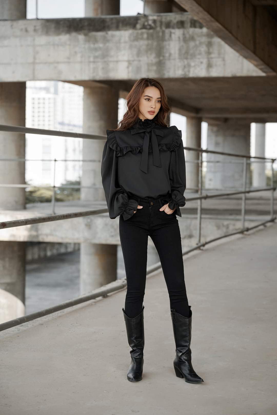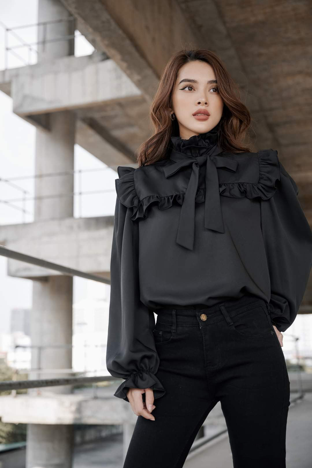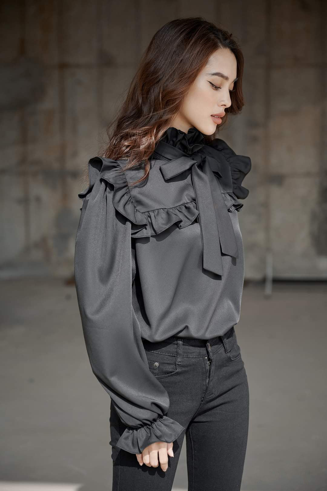 Indulge in luxury with the Mona Long Bishop Sleeve High Neck Frill Silk Blouse. Crafted with delicate silk and adorned with a high neck and frill detailing, this blouse exudes elegance and sophistication. The bishop sleeves add a touch of drama, making it the perfect statement piece for any occasion. Elevate your wardrobe with this exclusive piece.