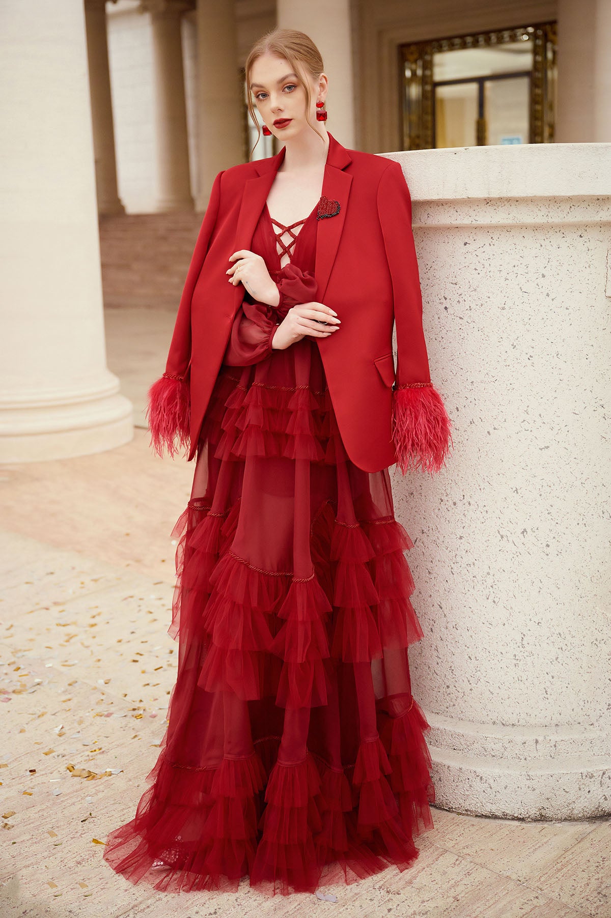 Indulge in luxury with our Naomi Plunge Neck Long Sleeves Ruffled Princess Dress. This elegant dress features a plunging neckline, long sleeves, and ruffled details fit for a princess. Make a statement at any event with this exclusive design. Unleash your inner royalty and turn heads in this sophisticated and tasteful dress.