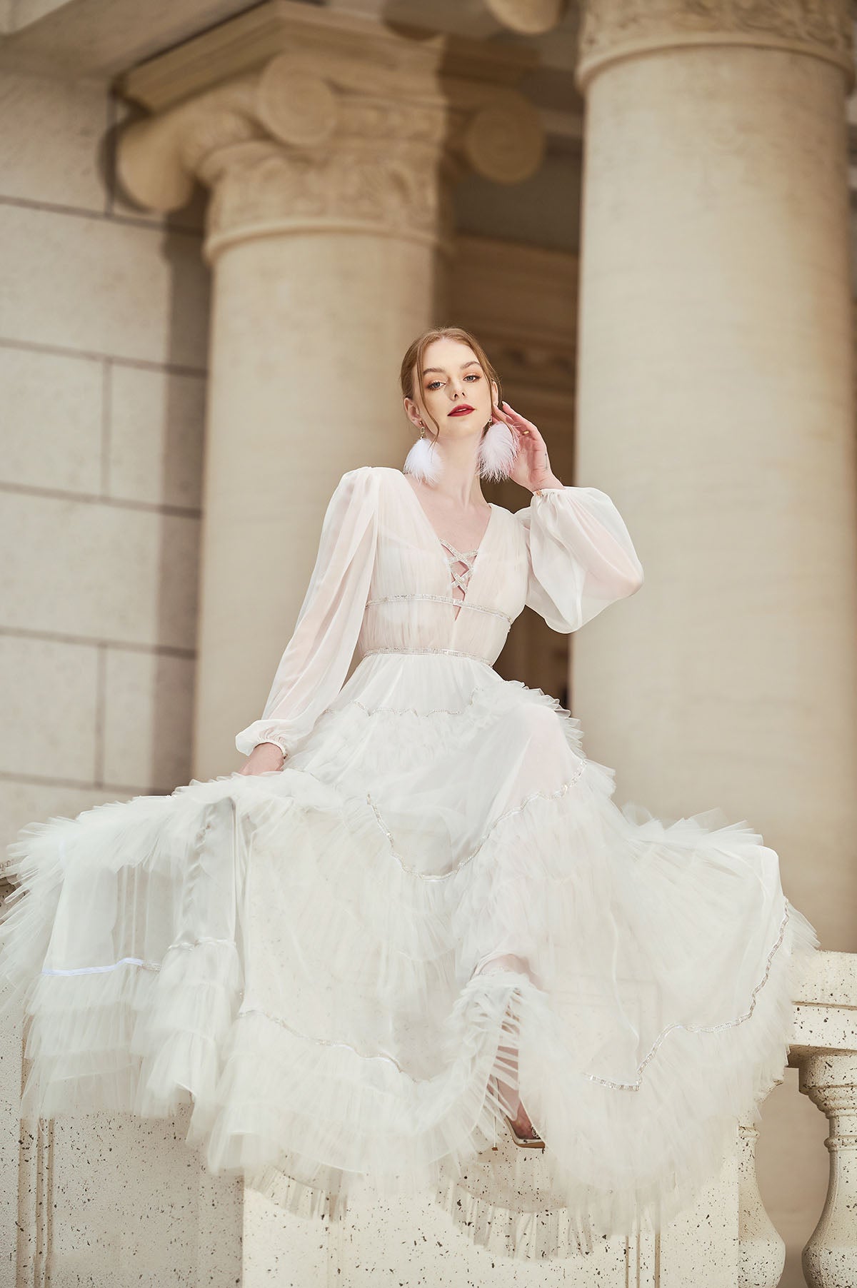 Indulge in luxury with our Naomi Plunge Neck Long Sleeves Ruffled Princess Dress. This elegant dress features a plunging neckline, long sleeves, and ruffled details fit for a princess. Make a statement at any event with this exclusive design. Unleash your inner royalty and turn heads in this sophisticated and tasteful dress.
