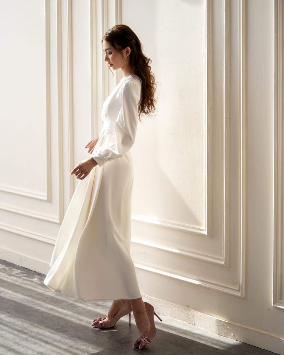 Indulge in the luxury of our Nicole V Neck Bishop Sleeves Midi Dress. The elegant aline swing silhouette and sophisticated bishop sleeves exude exclusivity and refinement. Perfect for any occasion, this dress will make you feel like a work of art. Elevate your wardrobe with this tasteful and timeless piece.