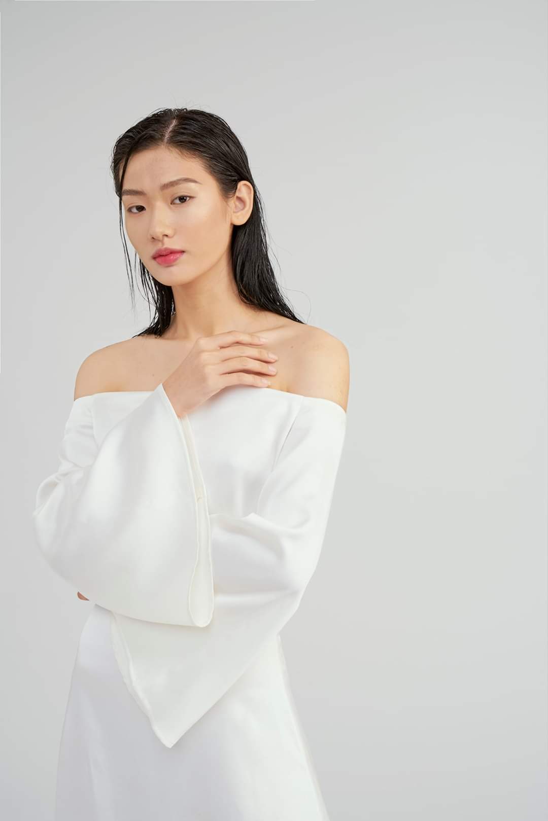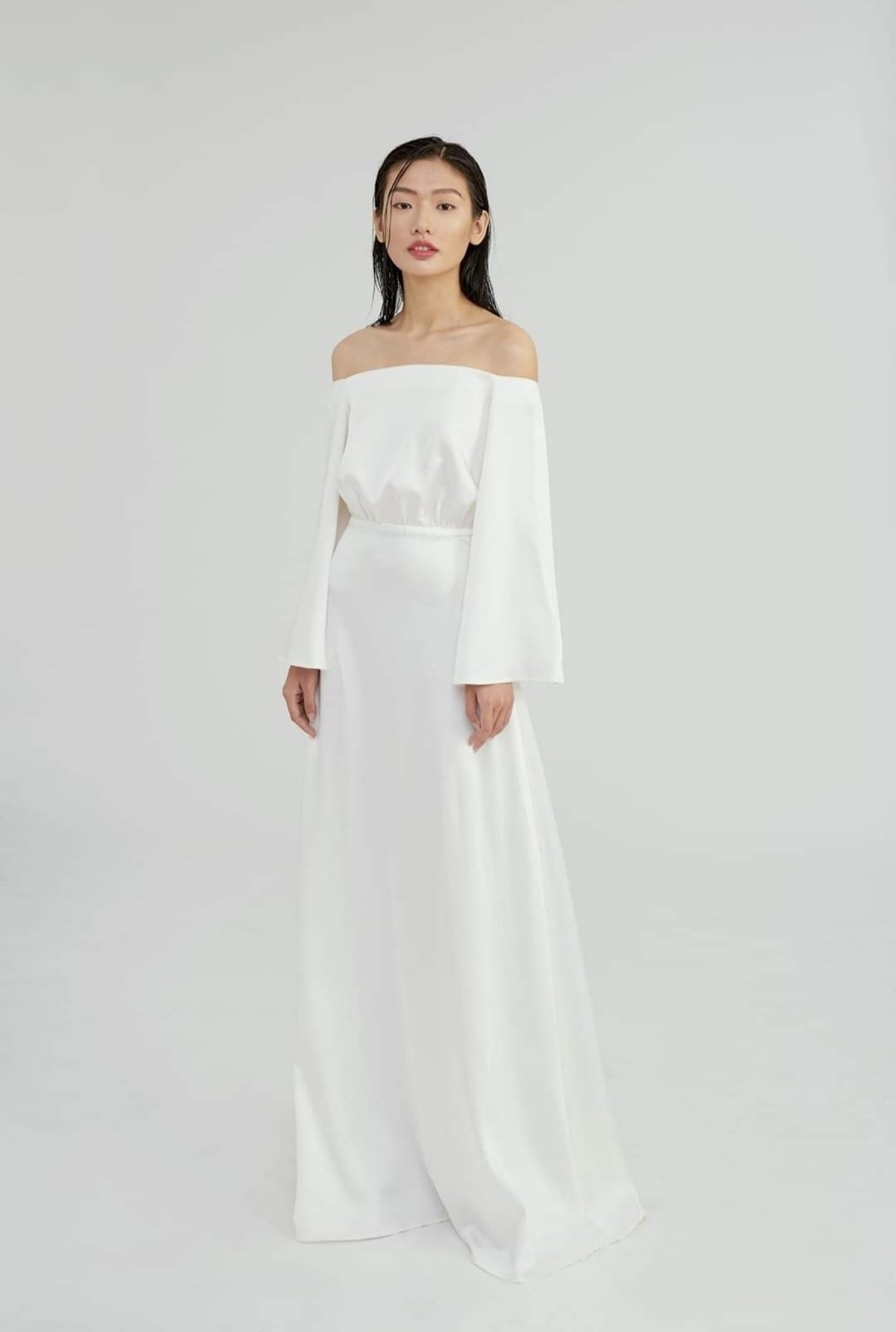 This off-shoulder silk dress from Sarah Luton captures effortless elegance and timeless charm. Designed with a draped neckline and flowing sleeves, the silhouette gracefully follows the body without clinging, offering both comfort and sophistication. Crafted from high-quality silk, the dress drapes beautifully and delivers a fluid, soft movement with each step. Ideal for formal occasions, garden events, or romantic evenings, this dress balances modern refinement with classic femininity. The clean, minimalist structure allows it to be styled up or down depending on the occasion, making it a versatile and refined choice in any luxury wardrobe.