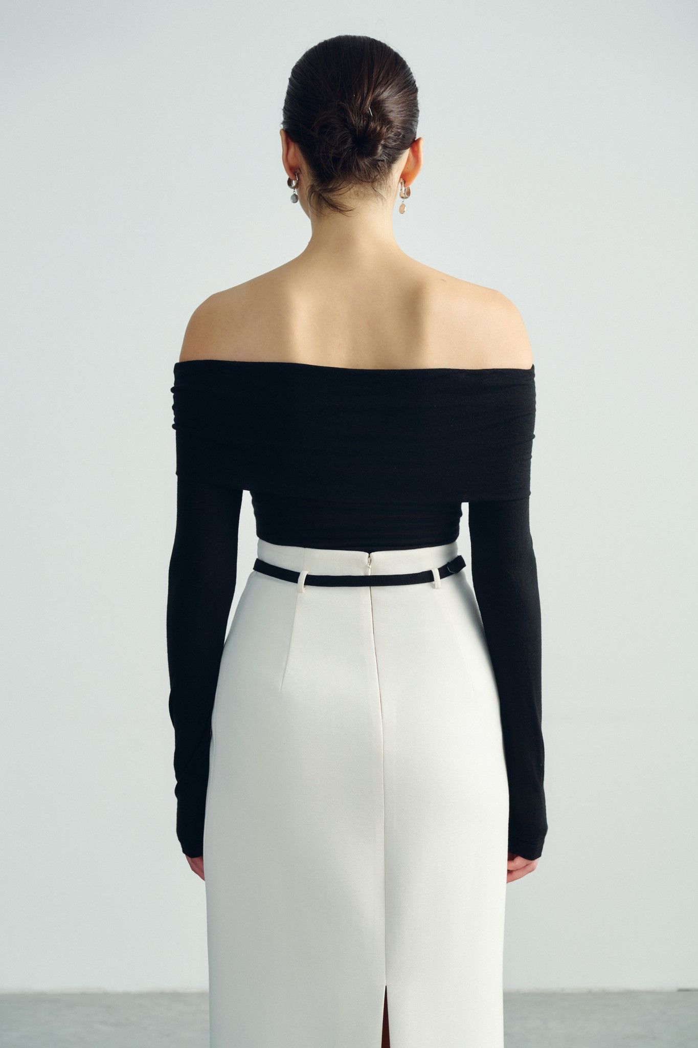 Crafted in soft stretch jersey, this off-shoulder top blends timeless charm with contemporary edge. The elegantly ruched neckline wraps around the shoulders, framing the collarbones and adding a sculptural element to the silhouette. Long sleeves balance the exposed neckline, creating a look that is both sophisticated and alluring. Whether paired with structured skirts or tailored pants, this piece delivers polished versatility. Designed by Laura Ren, it embodies modern femininity with refined ease.