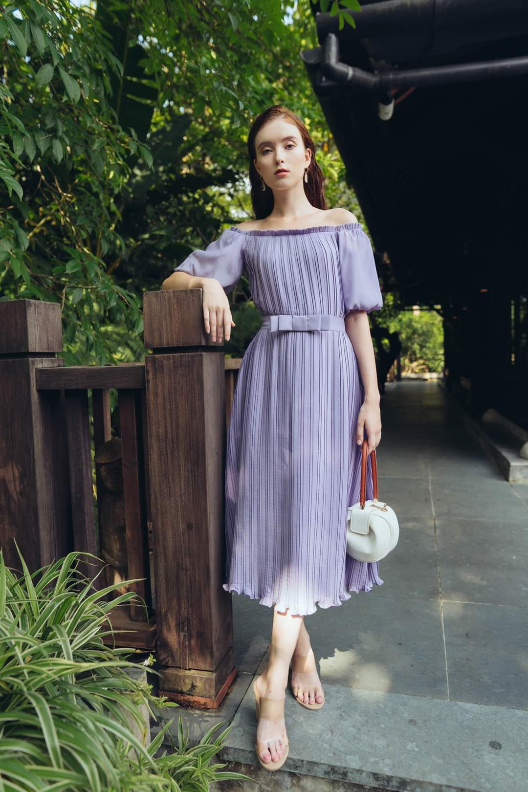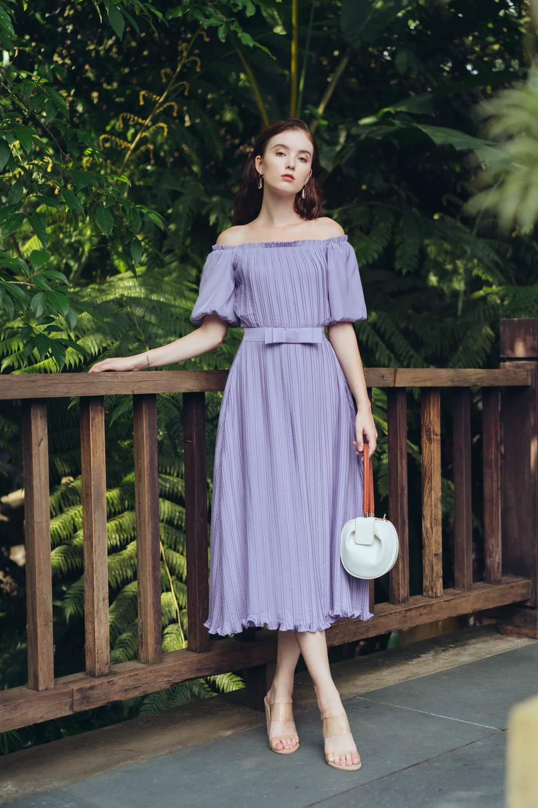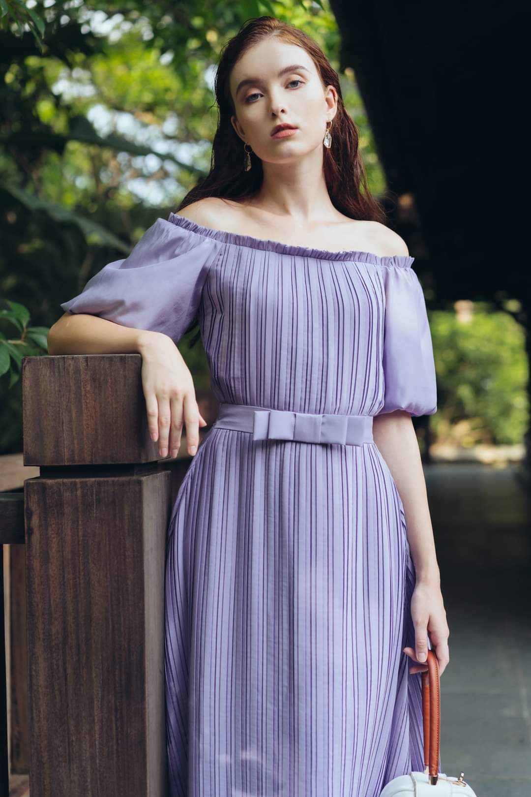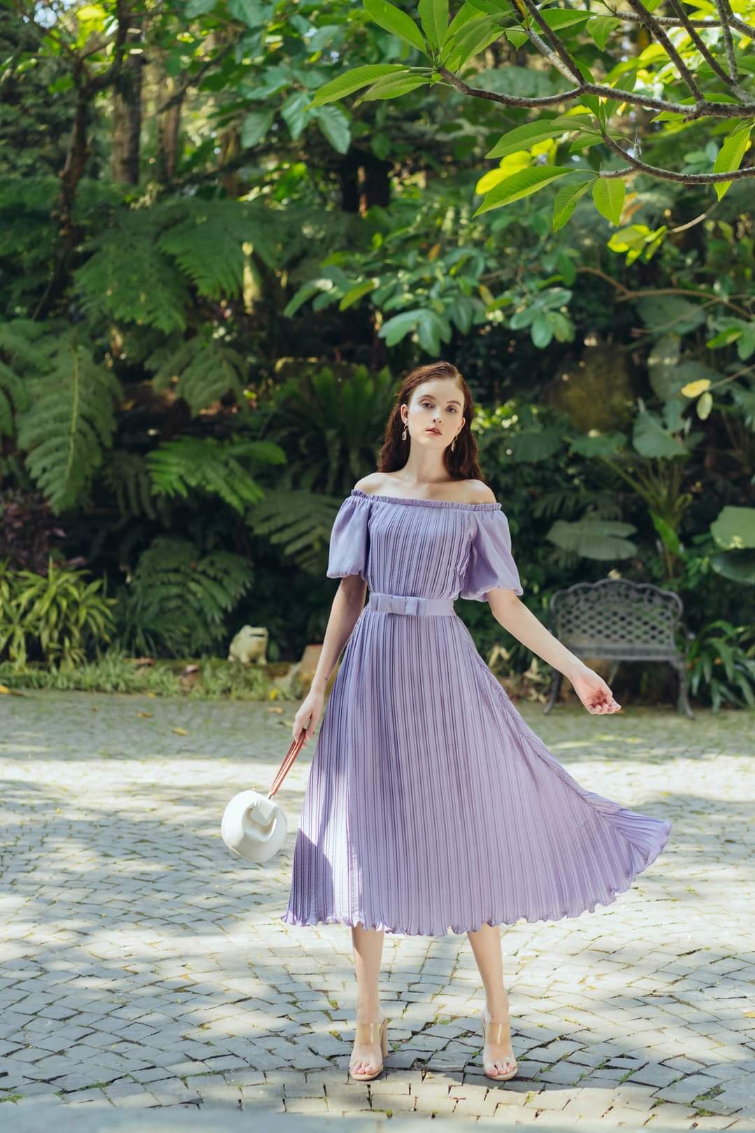 Make a graceful statement in this off-shoulder pleated silk dress from Sarah Luton, designed to bring fluid movement and effortless femininity to your look. Crafted from breathable, lightweight silk, it features an elegant pleated skirt that sways with every step, soft puff sleeves for a romantic touch, and a fitted waistband with a delicate bow to accentuate the silhouette. The off-shoulder neckline frames the collarbone beautifully, making it perfect for daytime events or evening garden parties. This dress captures the timeless elegance and modern charm that define the Sarah Luton collection.
