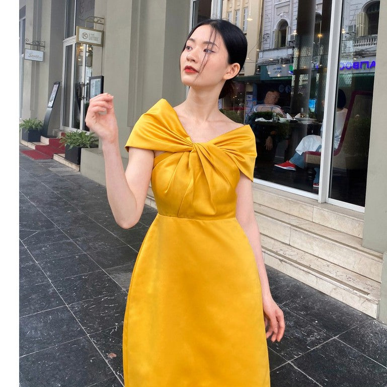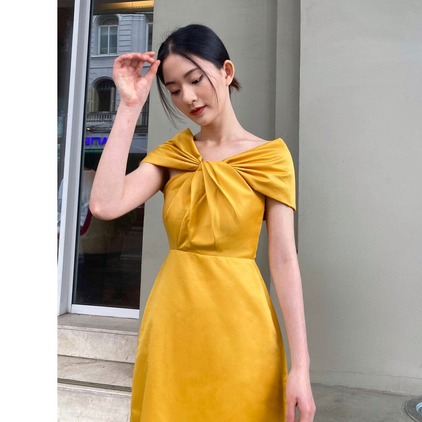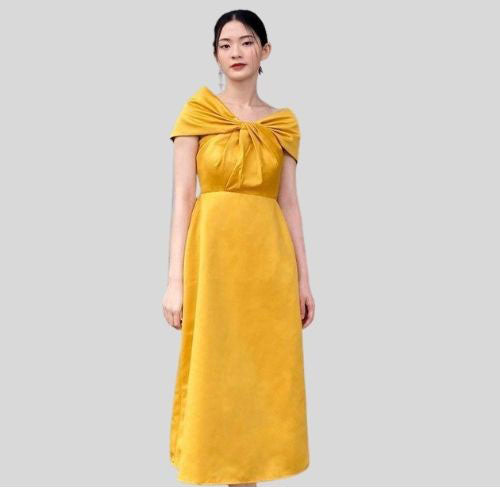 This exquisite silk midi dress by Sarah Luton captures timeless femininity with a modern twist. Designed with an off-shoulder neckline and an elegant front knot detail, it gracefully accentuates the collarbones while adding a soft sculptural element. The smooth silk fabric offers a fluid drape, enhancing the refined A-line silhouette for a flattering fit. Perfect for formal gatherings, evening events, or special occasions, this piece speaks to those who appreciate understated glamour and refined tailoring. Elevate your wardrobe with this graceful and versatile statement dress.