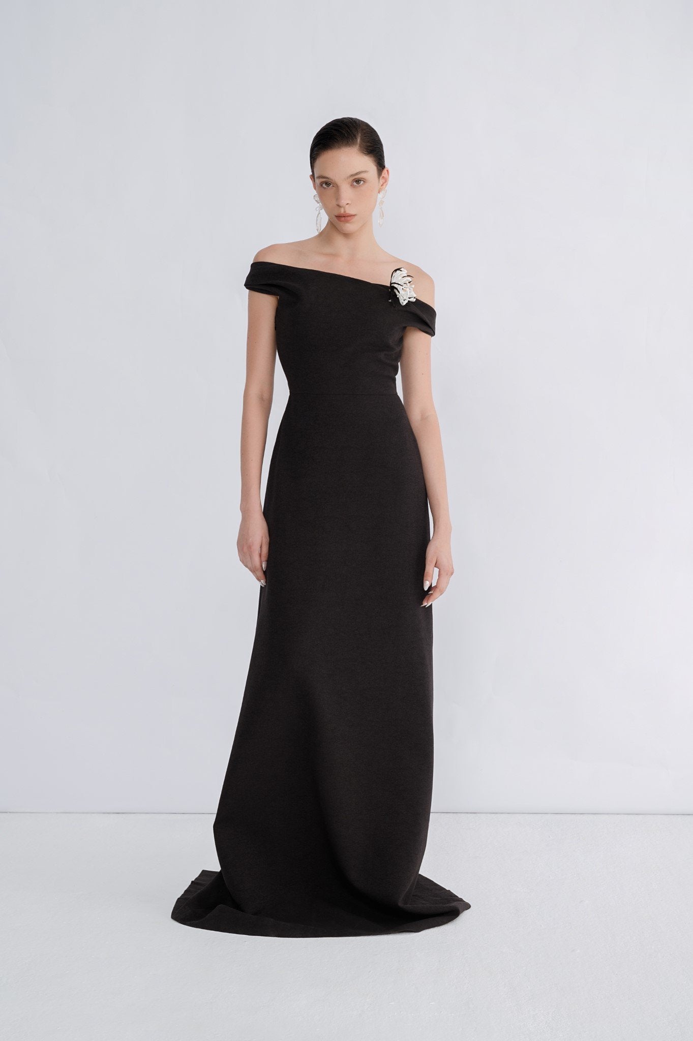 Laura Ren presents a timeless silhouette with this off-shoulder wool blend gown—crafted to embody refined elegance and graceful structure. Designed with a fitted bodice and gently flared hem, the dress features a draped fold-over neckline that showcases the décolletage with understated sophistication. A subtle side slit adds movement to the floor-length skirt, while the structured wool blend ensures it holds its elegant form throughout wear. Ideal for formal evenings or special celebrations, this design highlights Laura Ren’s signature balance of modern femininity and architectural tailoring.