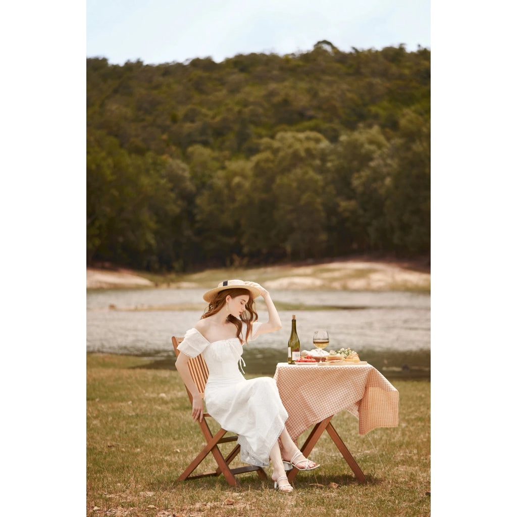 This romantic organza midi dress from Sarah Luton showcases ethereal elegance and refined craftsmanship. The structured sweetheart neckline enhances the silhouette, while off-shoulder puff sleeves add a soft, feminine charm. Featuring a high slit that offers graceful movement and allure, this dress is designed to flatter the figure with its fitted waist and flowing hemline. Perfect for outdoor soirées, summer occasions, or garden weddings, the lightweight organza fabric lends an airy feel and timeless appeal. A dreamy blend of sophistication and sensuality in every detail.