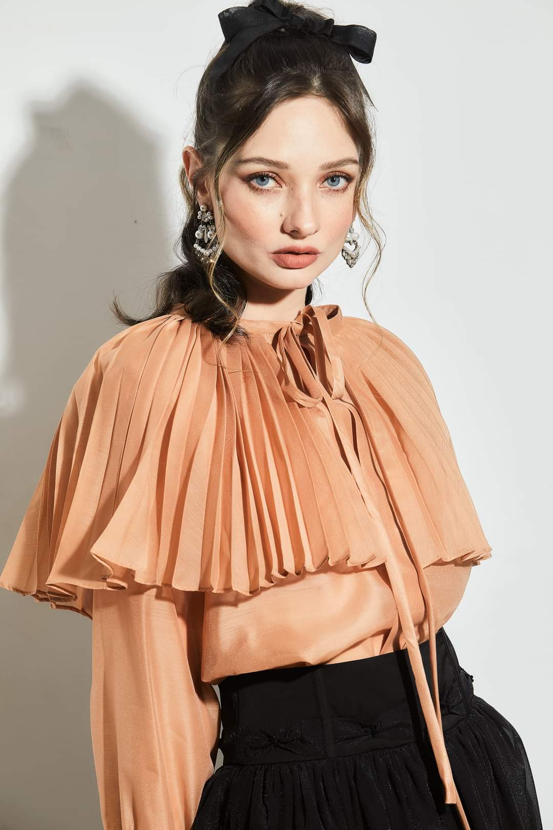 Elevate your wardrobe with this pleated cape sleeve silk blouse from Sarah Luton. Crafted from premium silk, this blouse features a flowing silhouette with structured pleats draped over the shoulders, adding dramatic movement and volume. A high neckline with a delicate tie detail brings an air of classic femininity, perfect for both daywear elegance and evening sophistication. The lightweight silk offers a gentle sheen and breathable comfort, making it ideal for warm seasons or layering under blazers. Style this versatile top with high-waisted skirts or tailored trousers for a refined, modern look.