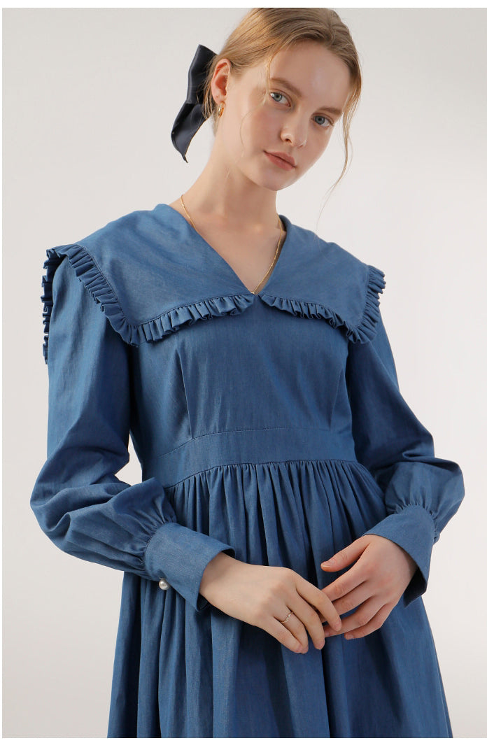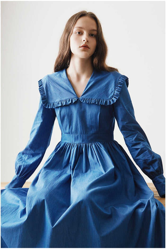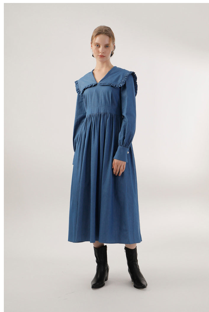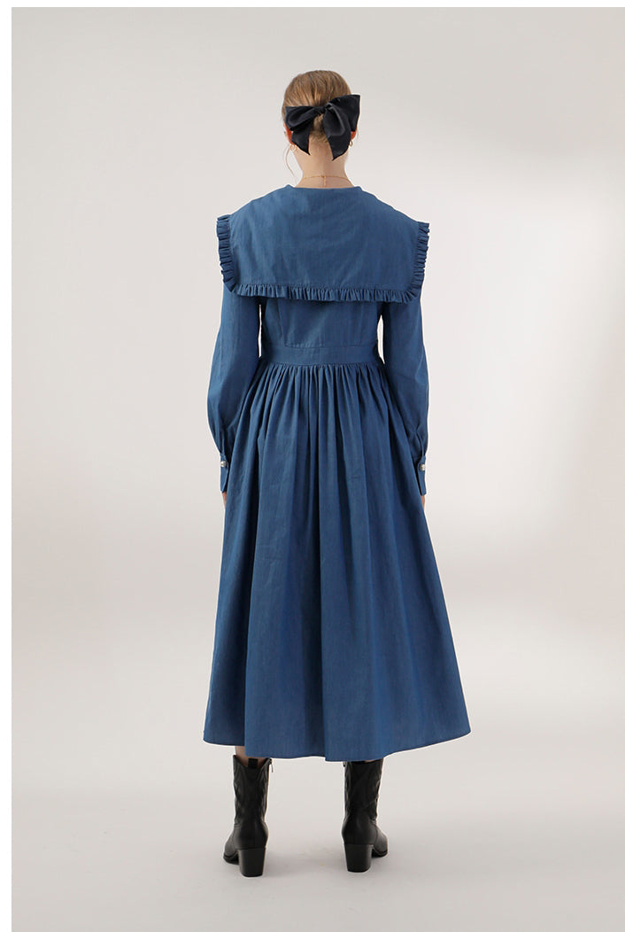 Sarah Luton presents this charming linen midi dress, crafted from breathable natural fibers and tailored with a romantic frilled sailor collar. Featuring a flattering V-neckline, gathered waist, and long cuffed sleeves, this dress flows beautifully into a full pleated skirt. Ideal for day-to-evening transitions, it blends vintage elegance with modern femininity. Elevate your wardrobe with a timeless silhouette reimagined in premium linen.