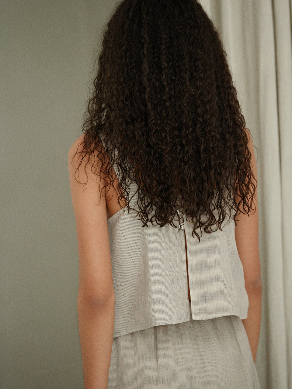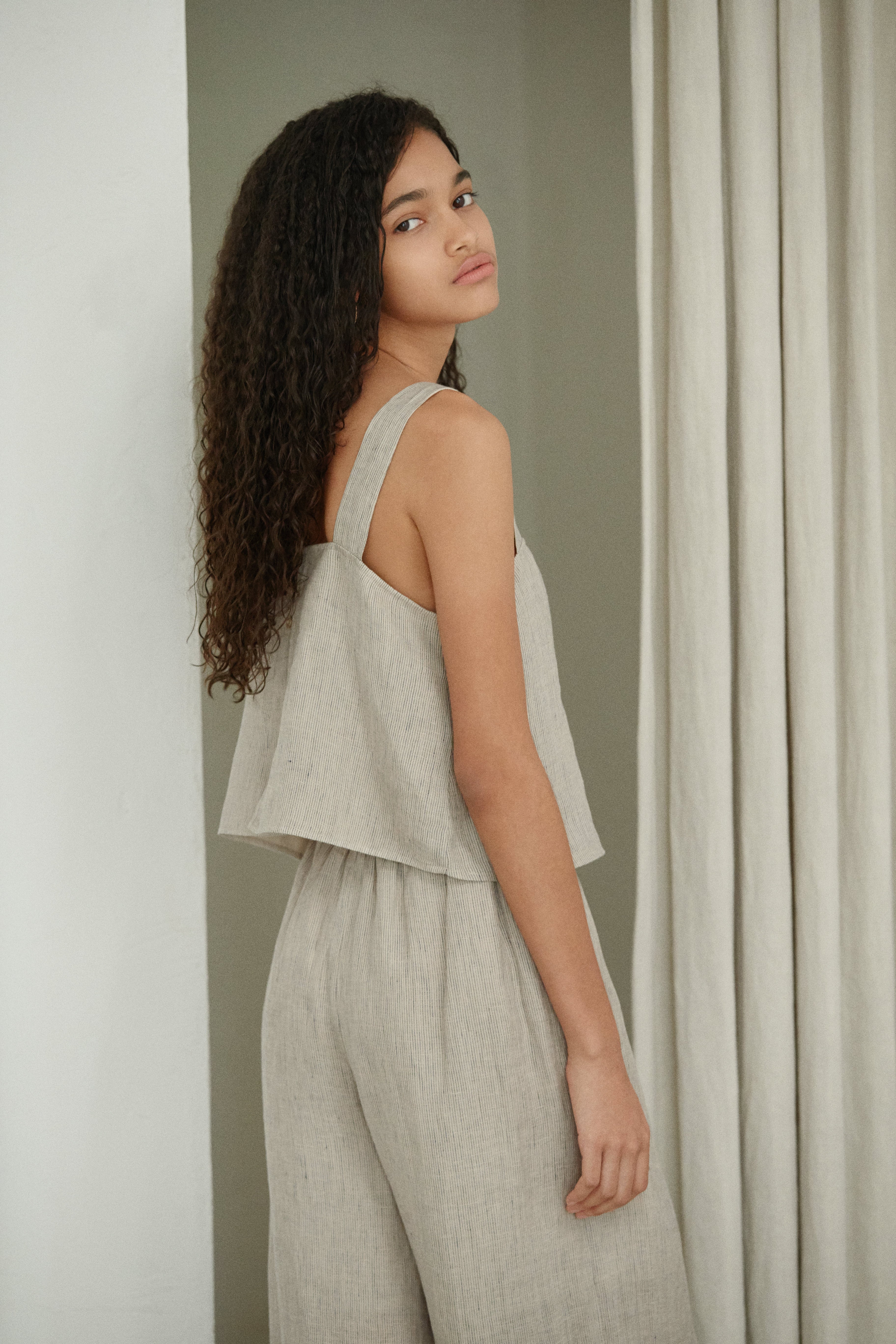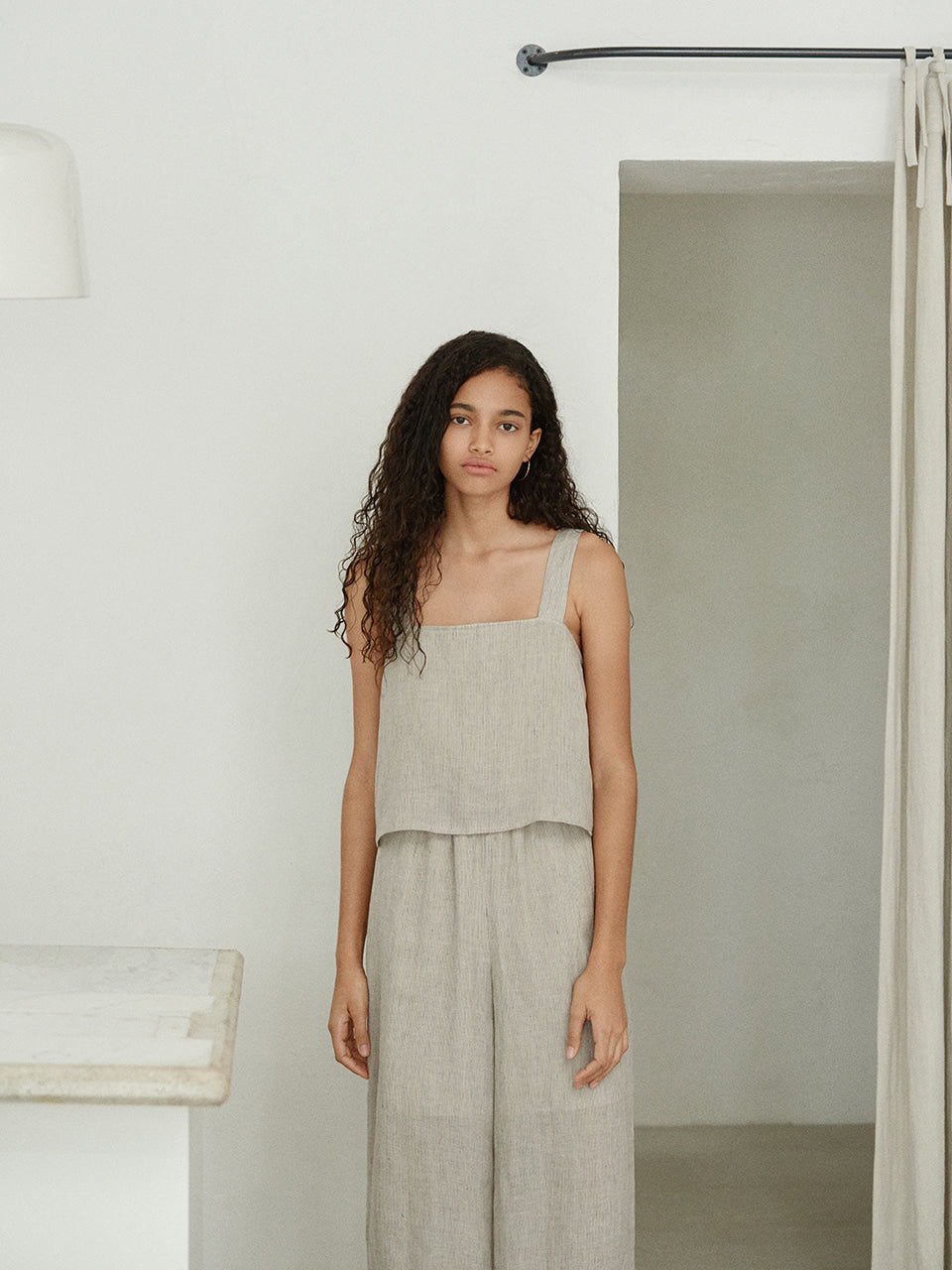 The Pleated Linen Sleeveless Top by Sarah Luton blends ease and elegance in a modern silhouette. Crafted from breathable linen with subtle vertical stripes, it features wide straps, a relaxed fit, and a delicate back keyhole with button closure. The airy design makes it perfect for warm-weather styling, while its minimal aesthetic ensures versatility from day to night. A refined essential for effortless luxury.