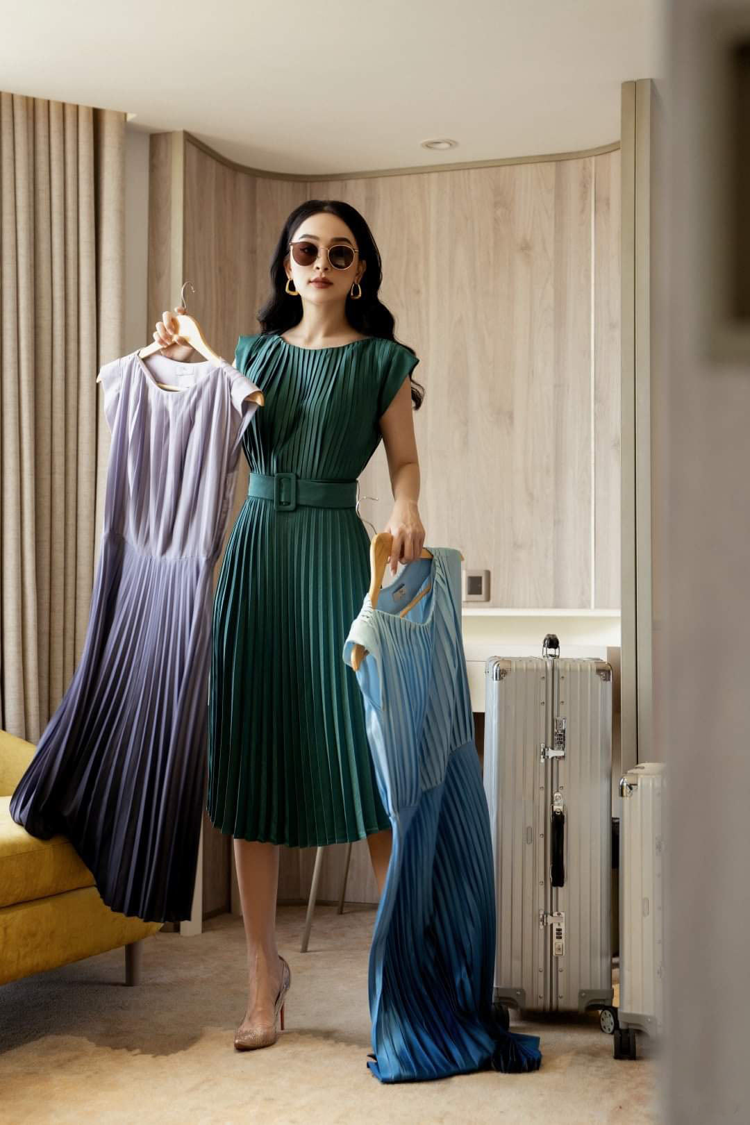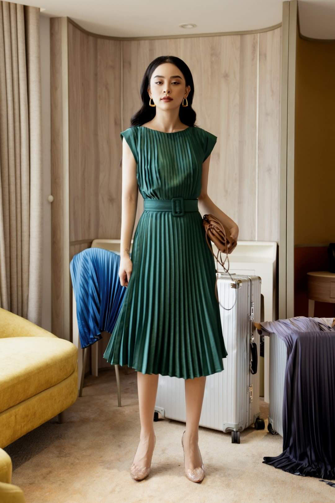 Designed to captivate with movement and grace, this pleated midi silk dress from Sarah Luton blends timeless silhouette with modern detailing. Crafted in fluid silk, the dress features soft accordion pleats that offer beautiful drape and flow. A wide, tonal belt cinches the waist for a flattering fit, while cap sleeves and a high neckline add refined charm. Ideal for events, business lunches, or elevated daytime outings, this silk dress is a versatile piece for the modern woman. The lightweight construction ensures all-day comfort without compromising on style.