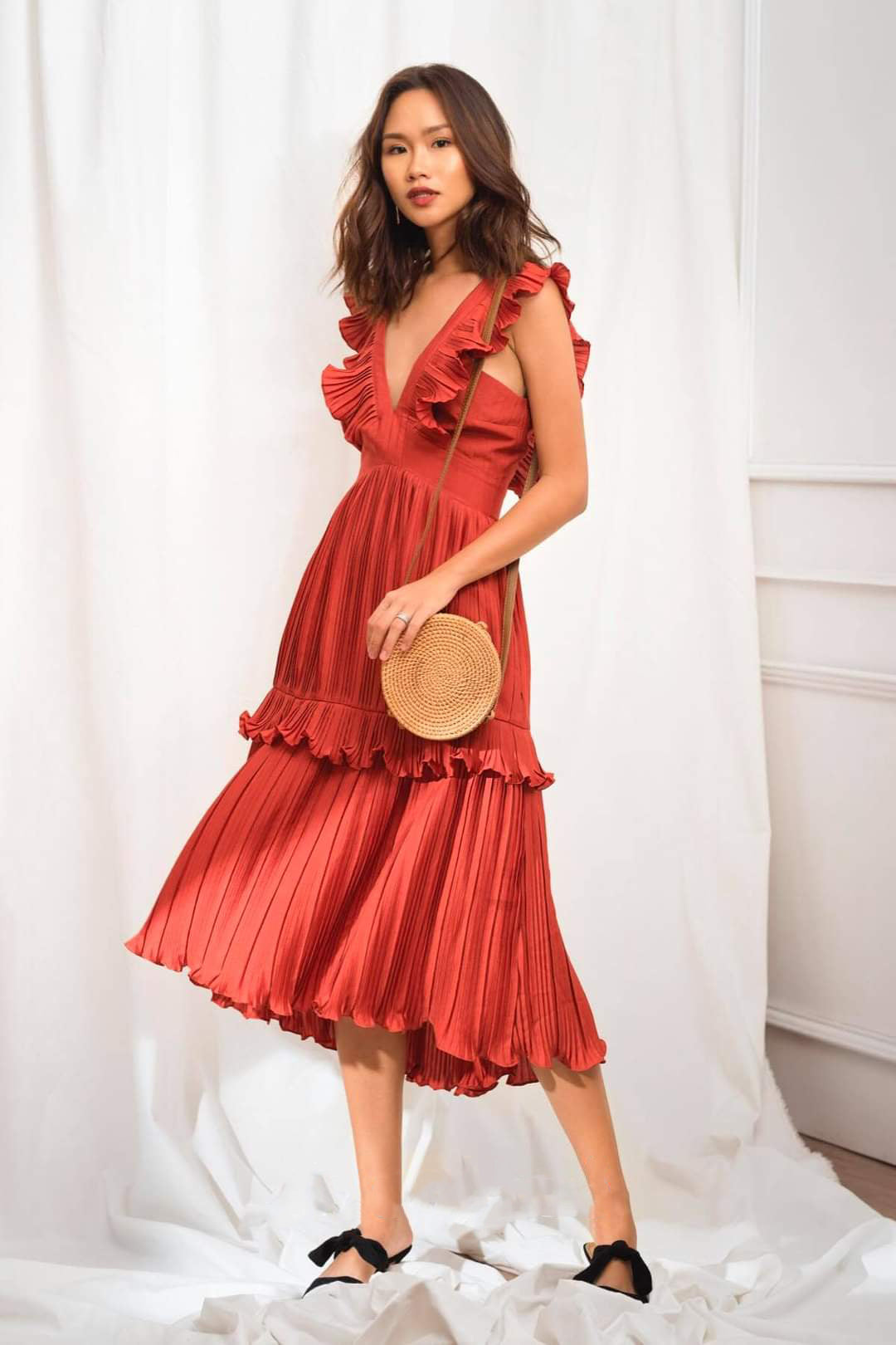 Make a bold statement with this pleated silk midi dress from Sarah Luton. Designed with a plunging V-neckline and delicately ruffled shoulders, this dress flatters the silhouette while offering dramatic texture and movement. The all-over pleating lends a sculptural feel, and the elegant backless design adds allure for evening occasions. Crafted in flowing silk, this dress transitions beautifully from day parties to twilight celebrations. Sarah Luton brings refined femininity and expert tailoring to every detail of this standout piece.