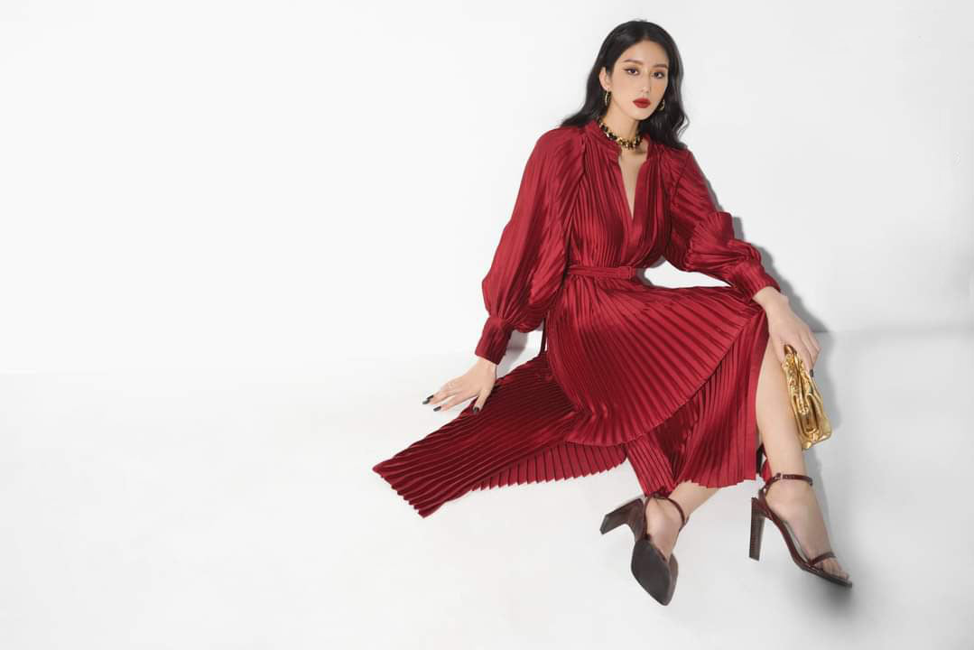 This pleated silk midi dress from Sarah Luton brings together fluid movement and timeless grace. Designed with voluminous long sleeves and a plunging V-neckline, the dress features a flattering wrap silhouette cinched at the waist with a matching belt. The soft pleats add texture and elegance, creating a silhouette that flows with every step. Ideal for both daytime sophistication and evening affairs, this piece offers a refined take on classic feminine style. Elevate your occasion wardrobe with this effortlessly elegant creation from Sarah Luton.
