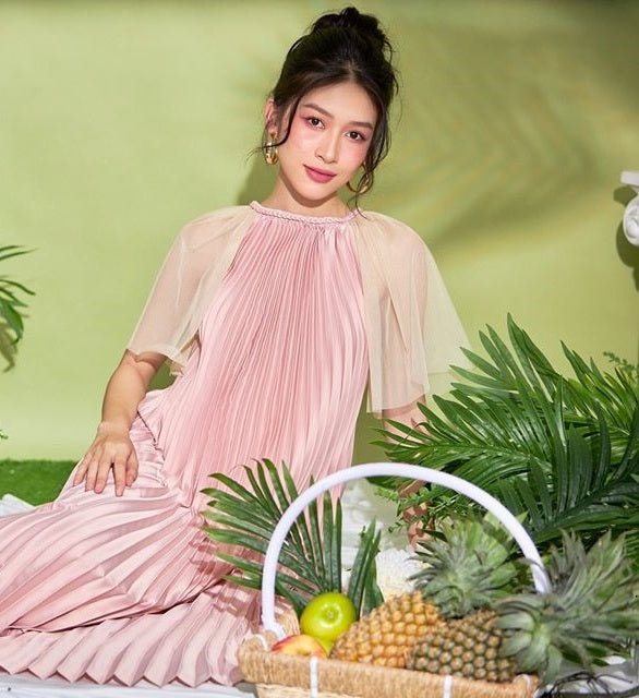 Sarah Luton presents this elegant pleated silk midi dress, a timeless blend of sophistication and comfort. Crafted from high-quality silk, this design features a flattering A-line silhouette that flows effortlessly with every step. The dress is adorned with sheer cape sleeves and a softly gathered neckline, offering a romantic and ethereal touch. Its mid-length hemline and fluid pleats create graceful movement, making it perfect for daytime events, garden parties, or a refined resort look. Designed for women who appreciate luxurious textures and feminine silhouettes.